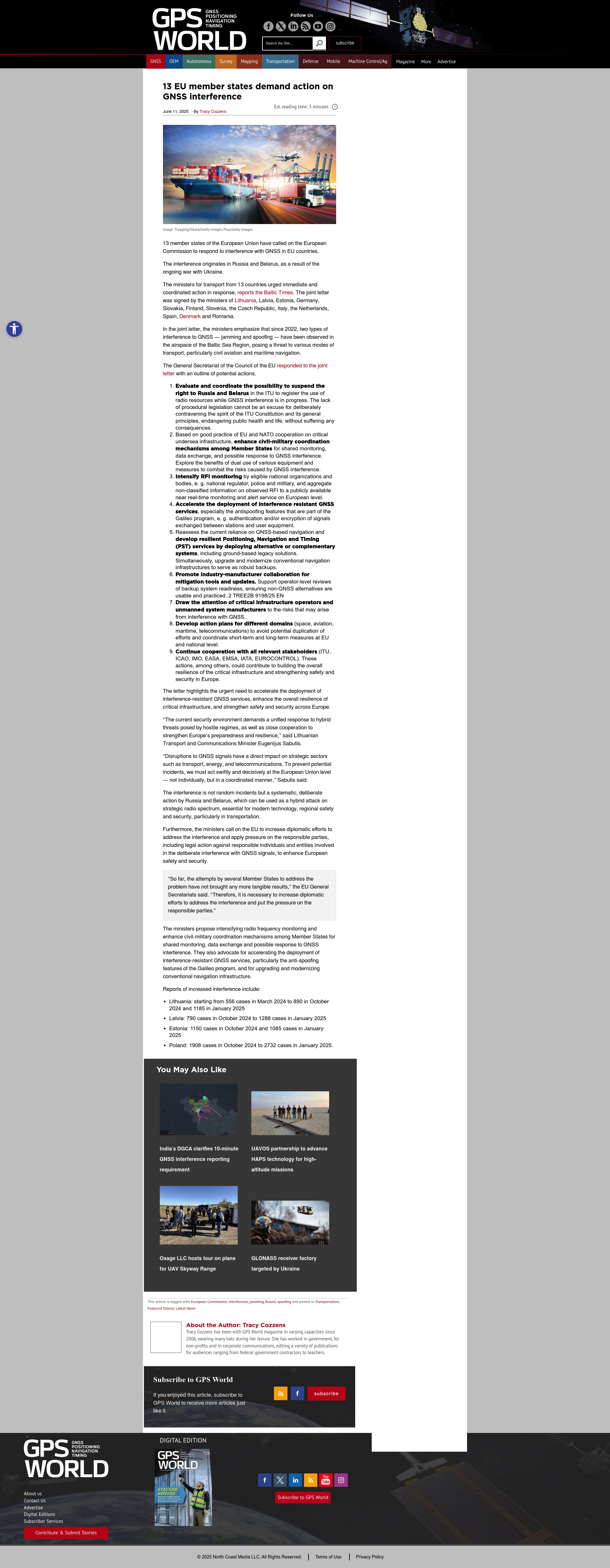 Short Summary: Thirteen EU members call on the European Commission for urgent action to address GNSS interference linked to Russia and Belarus.