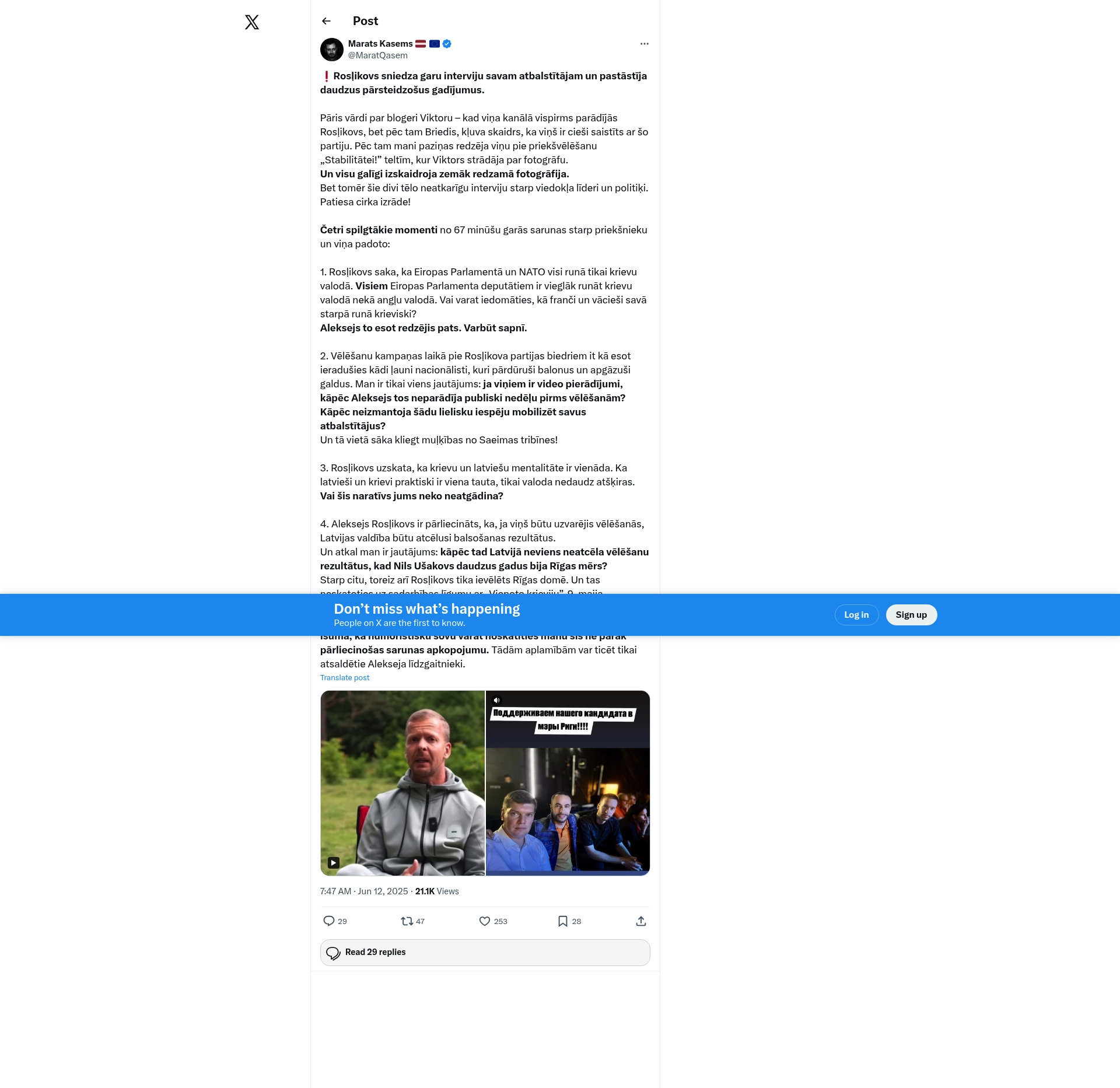 Extended Summary: On June 12, 2025, Marats Kasems posted a detailed overview of a lengthy interview with Aleksejs Rosļikovs' supporter, exposing key issues in Latvia's local political landscape. Rosļikovs, a candidate linked to pro-Russian sentiment, stated that European Parliament and NATO discussions occur only in Russian among his associates, signaling a strong linguistic-political alignment. The interview also noted disruptive activities by nationalists during the campaign targeting Rosļikovs' party members, raising concerns about election integrity and political tensions. Moreover, Rosļikovs equates Russian and Latvian mentalities and implied potential post-election legal challenges had he won. This narrative reveals an undercurrent of pro-Russian mobilization efforts within Latvian elections and highlights the ongoing societal divide in national identity and political orientation. The post drew significant attention with over 21,000 views, indicating public interest in this politically sensitive issue.