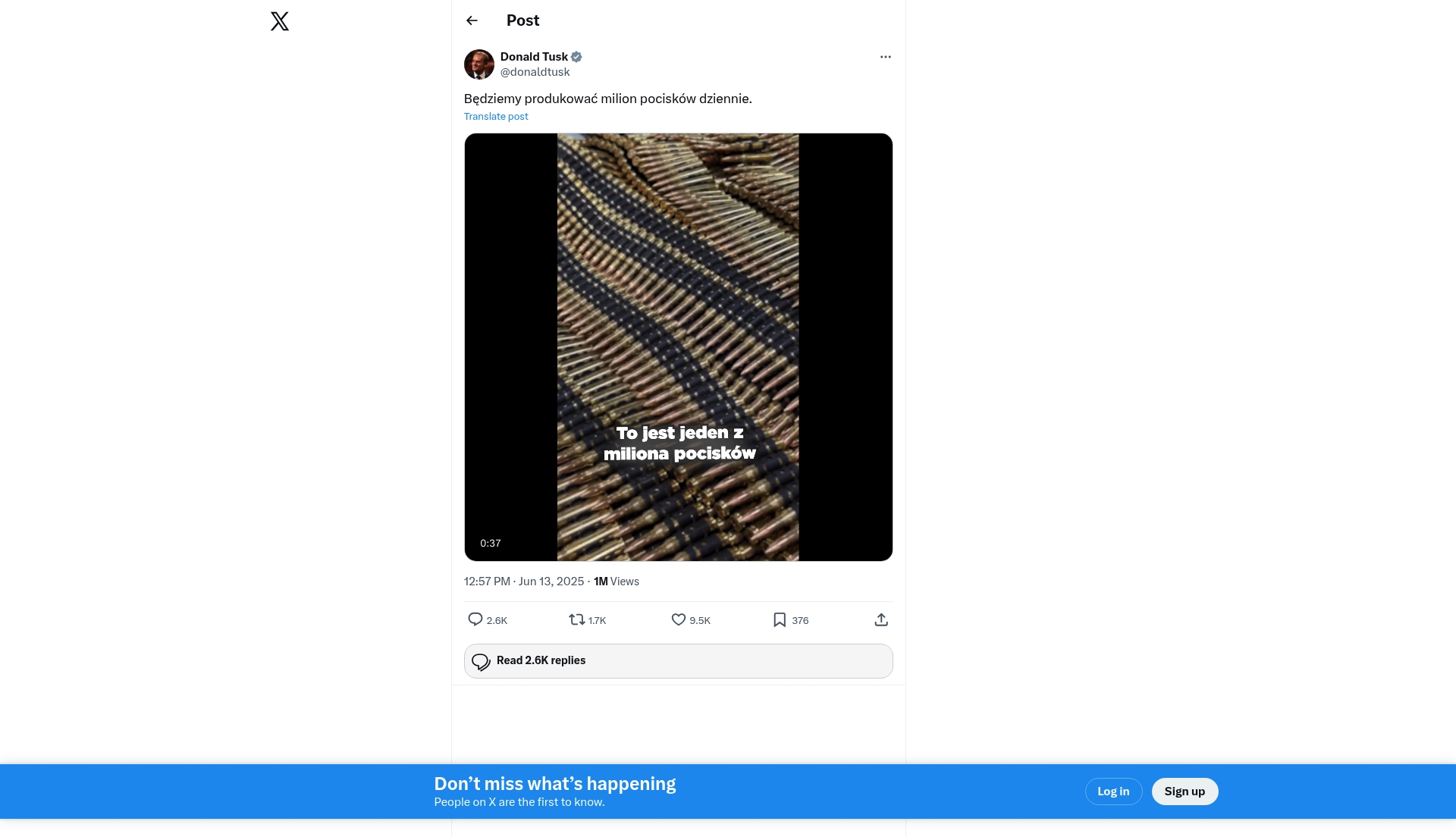Polish politician Donald Tusk posted a video stating that Poland will produce one million bullets daily. The post, dated June 13, 2025, shows ammunition belts with a caption translating as 'This is one of a million bullets.' This indicates a notable increase or emphasis on ammunition production, likely in response to regional security concerns.