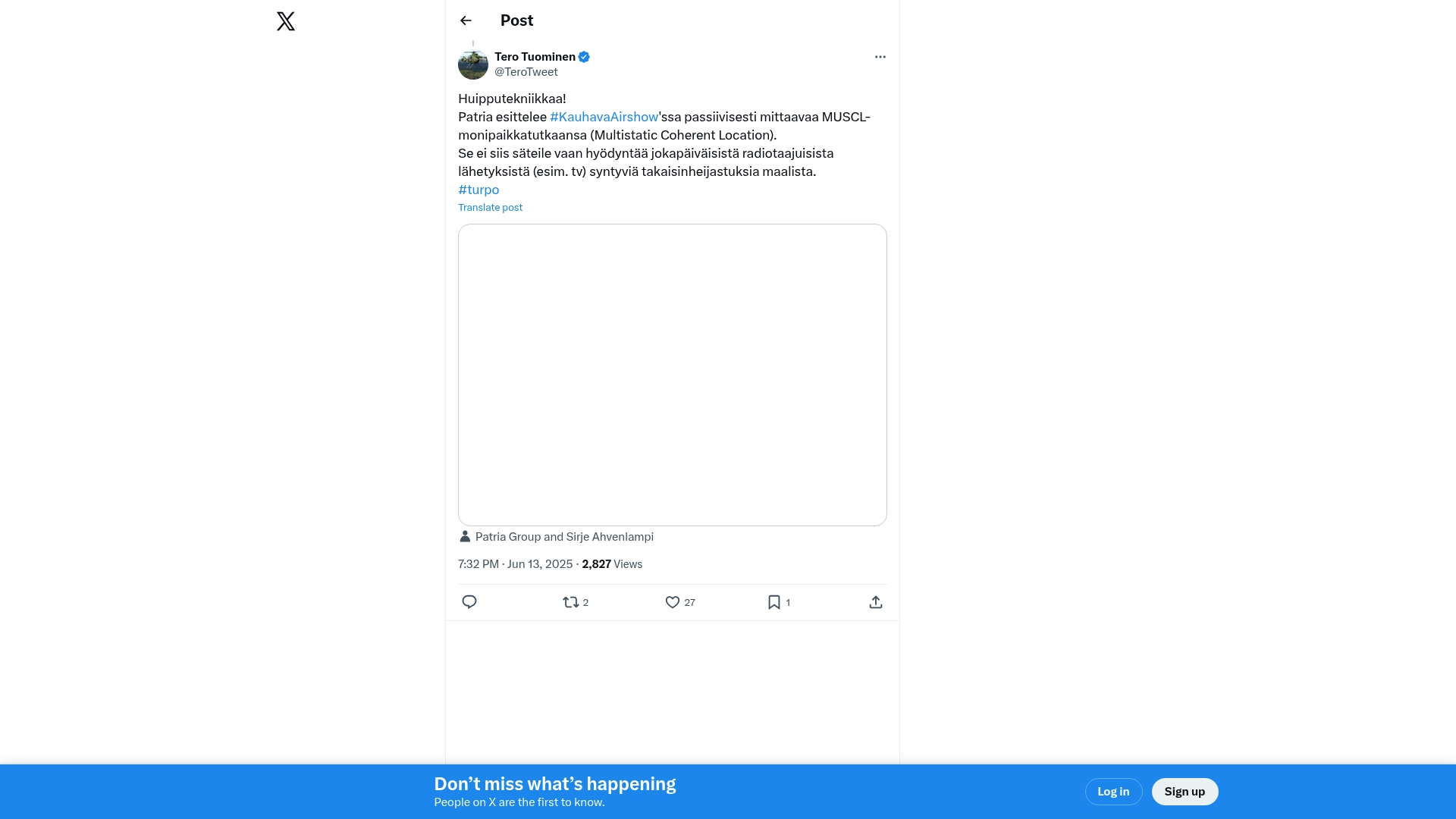 At the Kauhava Airshow, Patria showcased its MUSCL multistatic coherent location radar technology. This system does not emit radiation but passively measures multipath reflections from everyday radio frequency sources such as TV broadcasts. The technology represents advanced passive radar capabilities useful for electronic warfare and surveillance.