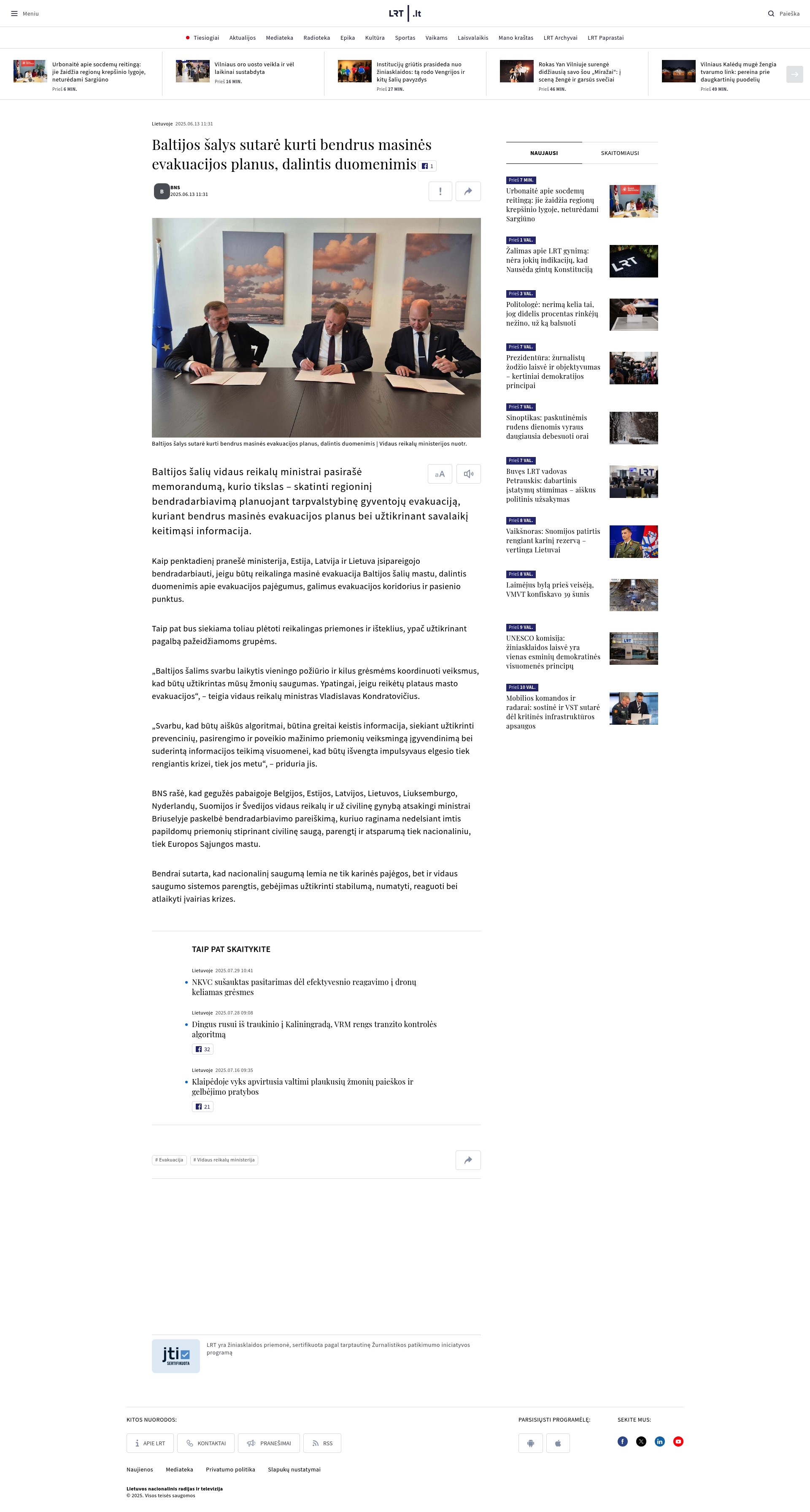 Baltic states' interior ministers signed a memorandum to promote regional cooperation on cross-border civilian evacuation planning by creating joint mass evacuation plans and ensuring timely information exchange. Estonia, Latvia, and Lithuania agreed to cooperate on mass evacuation at the Baltic scale, sharing data on evacuation capacities, potential evacuation corridors, and border crossing points, while also ensuring sufficient resources and aid for vulnerable groups. The initiative aims to maintain a unified approach to threats and coordinate actions to ensure population safety.