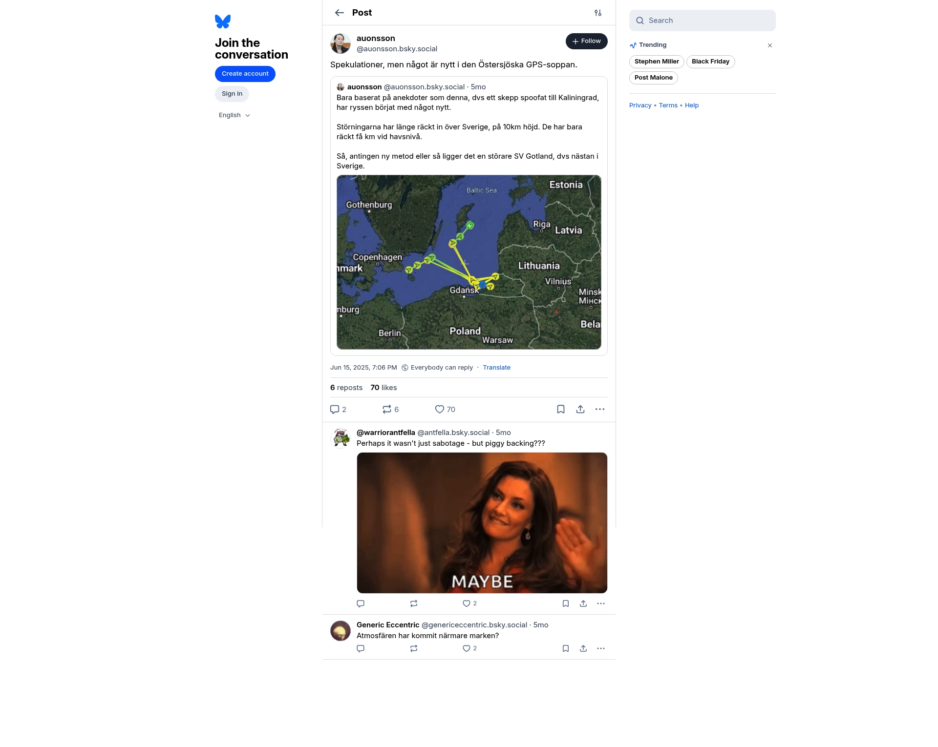 The user reports new disruptions in GPS signals over the Baltic Sea, noting the disturbances have affected Sweden up to 10 km altitude but only a few kilometers offshore. The speculation includes a suspicious cargo ship spoofed towards Kaliningrad, implying Russian involvement in these GPS interferences. The possibility of a new jamming method or a larger jammer near Gotland, Sweden is also discussed. The post includes a map showing affected maritime areas in the Baltic Sea near Poland and the Kaliningrad region.
