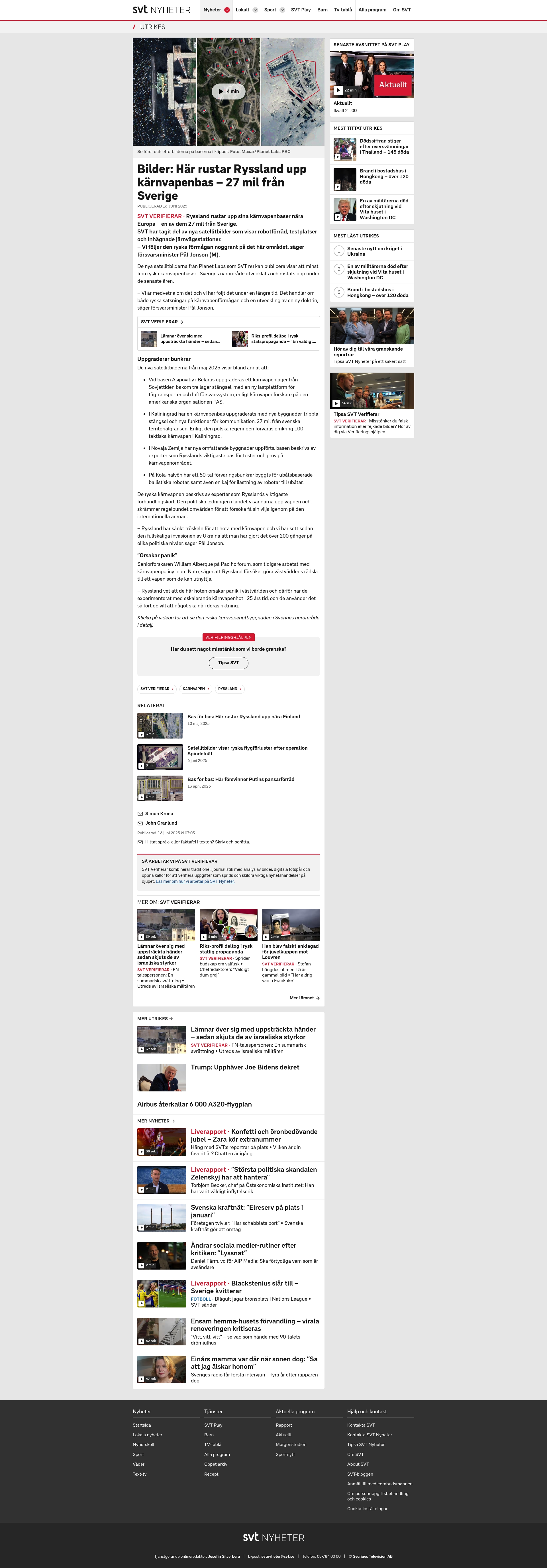 SVT reports that Russia is upgrading its nuclear weapons bases near Europe, approximately 27 mil (270 km) from Sweden. Satellite images reveal ongoing upgrades including new bunkers, triple fences, and improved communication facilities in Kaliningrad. Additional extensive construction and fortification work is happening on Novaja Zemlja. Russian military is actively developing the region as an important deterrence and strategic site with at least two major nuclear bases being fortified. Defense Minister Pål Jonson emphasizes monitoring of the capability expansion. This buildup occurs amid tensions and Russia's declared nuclear posture amid conflict with Ukraine.