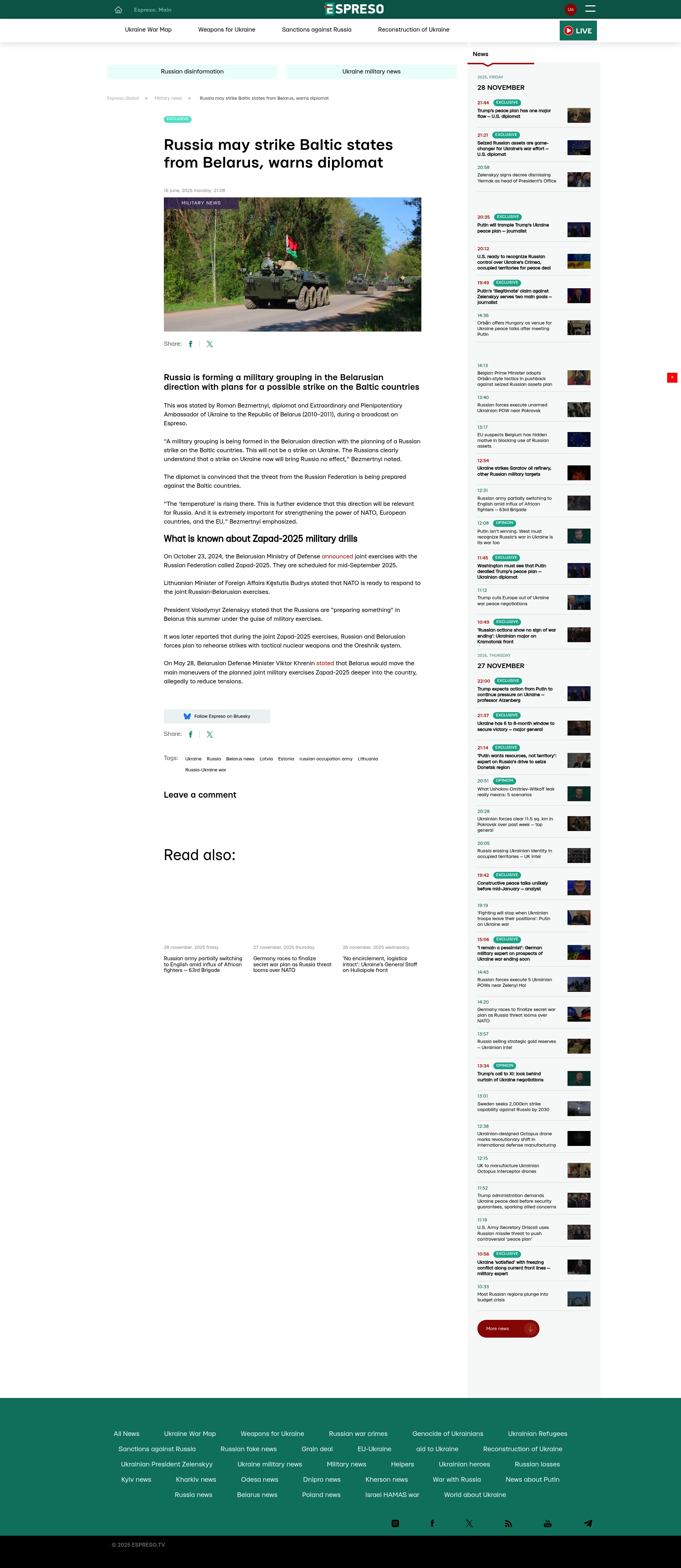 Roman Bezmertnyi, diplomat and former Ambassador of Ukraine to Belarus, warned that Russia is forming a military grouping in the Belarusian direction with plans for a possible strike on the Baltic states. He clarified that the strike is not against Ukraine but against the Baltic countries, emphasizing the rising threat from Russia in this region. The report also references the upcoming Zapad-2025 joint military drills by Russia and Belarus, which are scheduled for mid-September 2025. Lithuanian and Ukrainian officials reiterated readiness and concerns about Russian military maneuvers under the guise of exercises, including rehearsals involving tactical nuclear weapons.
