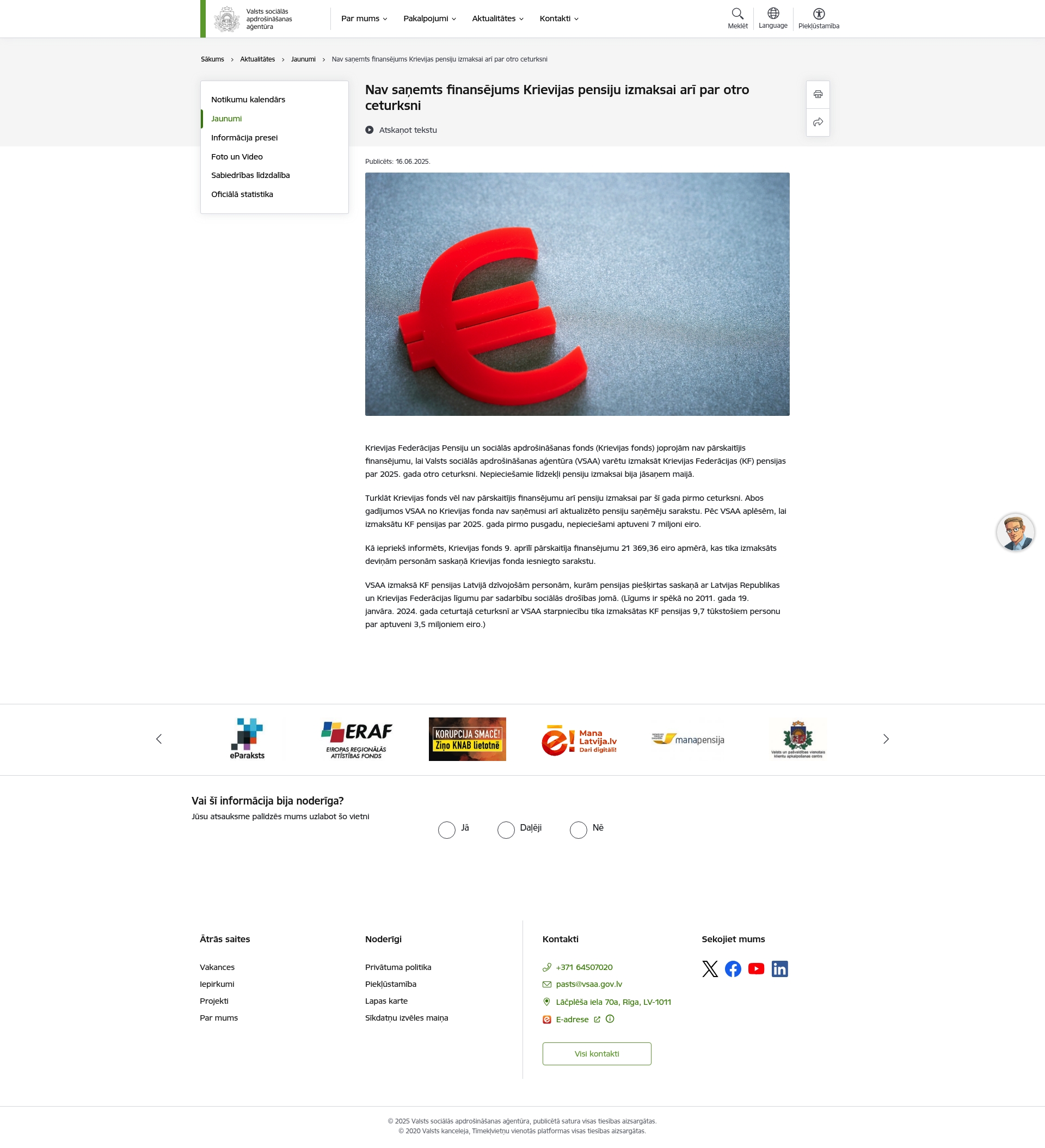 As of June 16, 2025, the Russian Federation's Pension and Social Insurance Fund has not transferred the funding required for the Latvian State Social Insurance Agency (VSAA) to pay Russian Federation (RF) pensions for the second quarter of 2025. Necessary funds for pension payments should be collected from Russia, but Russia has yet to transfer these funds for the first half of 2025. Previously, the RF fund transferred financing for the first quarter, and the VSAA received no updated pension recipient lists from the Russian fund for these periods. As of April 9, the RF fund had transferred 21,369.36 euros to pay pensions to nine persons according to the submitted list. Under the 2011 agreement between Latvia and Russia on social security cooperation, the VSAA pays RF pensions to approximately 9,700 persons in Latvia, disbursing about 3.5 million euros in the fourth quarter of 2024.
