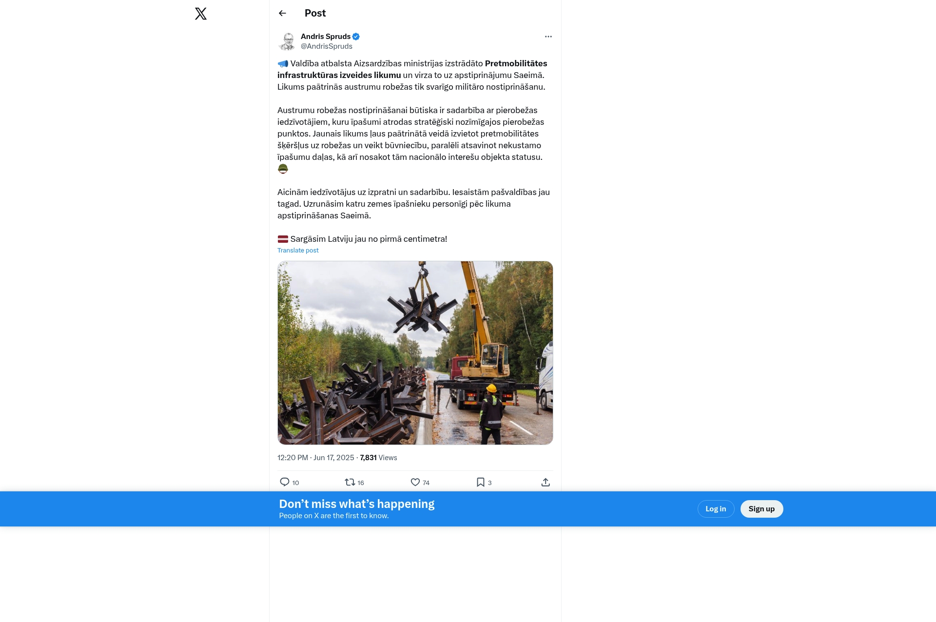 The Latvian government supports the Defense Ministry's development of the Anti-Mobility Infrastructure Creation Law, which has been submitted for approval to the Saeima (Latvian parliament). The law aims to accelerate the military fortification of the eastern border by enabling expedited placement of anti-mobility obstacles and construction, alongside compensation to property owners and designation of national interest object status. Cooperation with residents and local governments along the strategically important border is emphasized, with individual landowners to be contacted personally after the law's approval. The effort reflects a step towards strengthening Latvia's border security against potential threats.