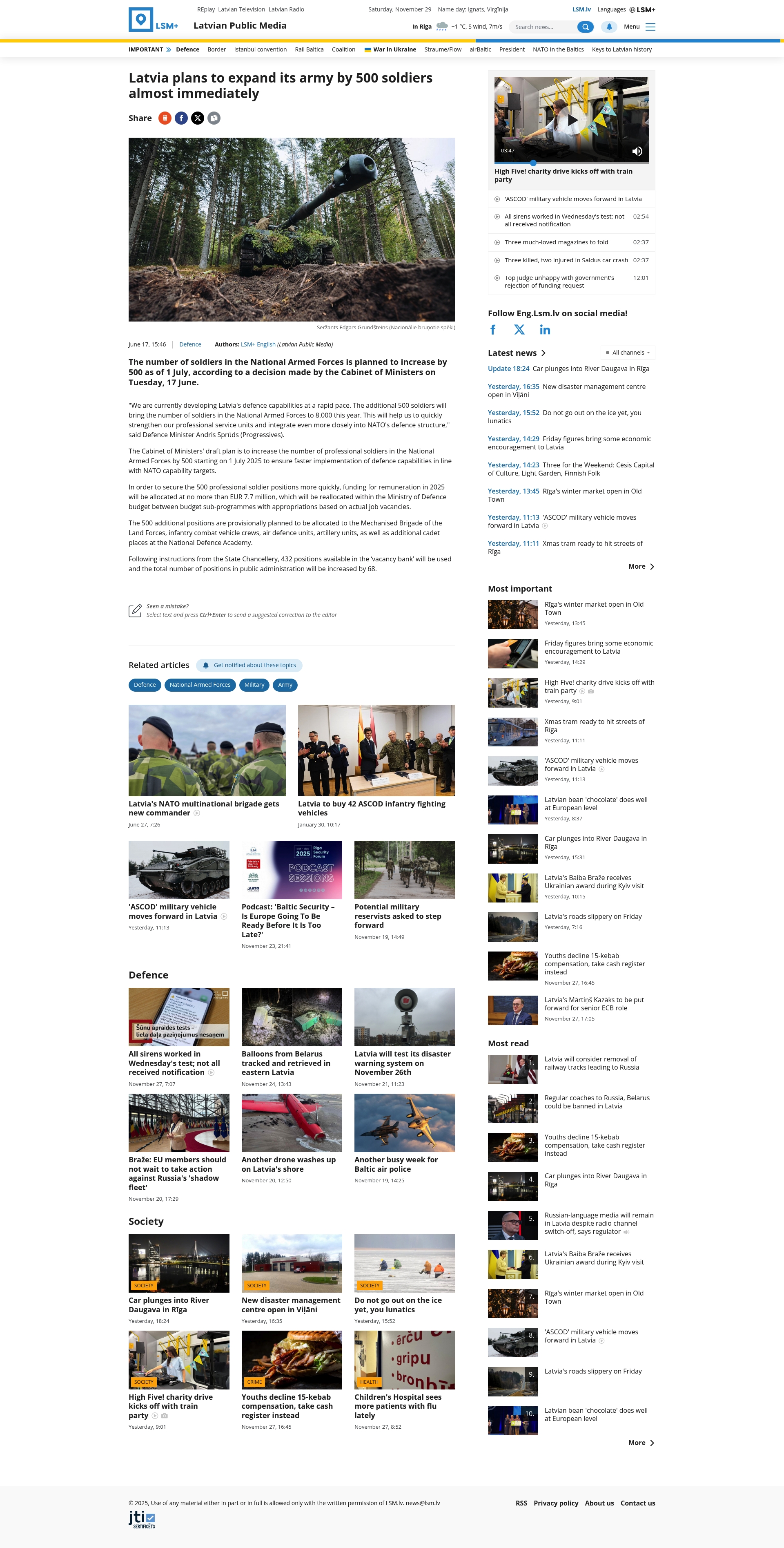 Latvia's Cabinet of Ministers decided on June 17, 2025, to increase the number of professional soldiers in the National Armed Forces by 500 starting July 1, 2025. This will bring the total number of soldiers to 8,000, with the aim of quickly strengthening Latvia's professional military service and more closely aligning with NATO defense structures. Funding for remuneration of these new soldiers in 2025, amounting to up to EUR 7.7 million, will be reallocated within the Ministry of Defence budget. These new positions are primarily planned for the Mechanised Brigade of the Land Forces, including infantry combat vehicle crews, air defence units, artillery units, and additional cadet places at the National Defence Academy. In addition, 432 positions from the public administration 'vacancy bank' will be used, increasing public administration positions by 68.