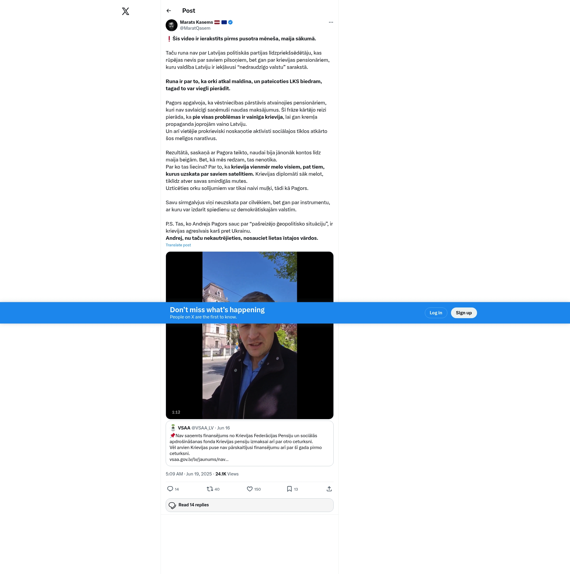 A video posted by a Latvian politician discusses misinformation circulated by a Latvian political party leader, who is accused of prioritizing Russian pensioners over Latvian citizens, and spreading Kremlin-aligned propaganda against Latvia. The video rebuts claims by Andrejs Pagors regarding the financial status of pensions paid to residents of Latvia, highlighting a deliberate falsehood by Russian diplomats and their local supporters. It stresses that the ongoing Russian aggression in Ukraine underpins these geopolitical narratives aimed at pressuring democratic states, urging truthfulness in naming the situation. The post includes a local government source stating that no pensions from the Russian Federation have been credited to recipients in Latvia as of this year’s first quarter.