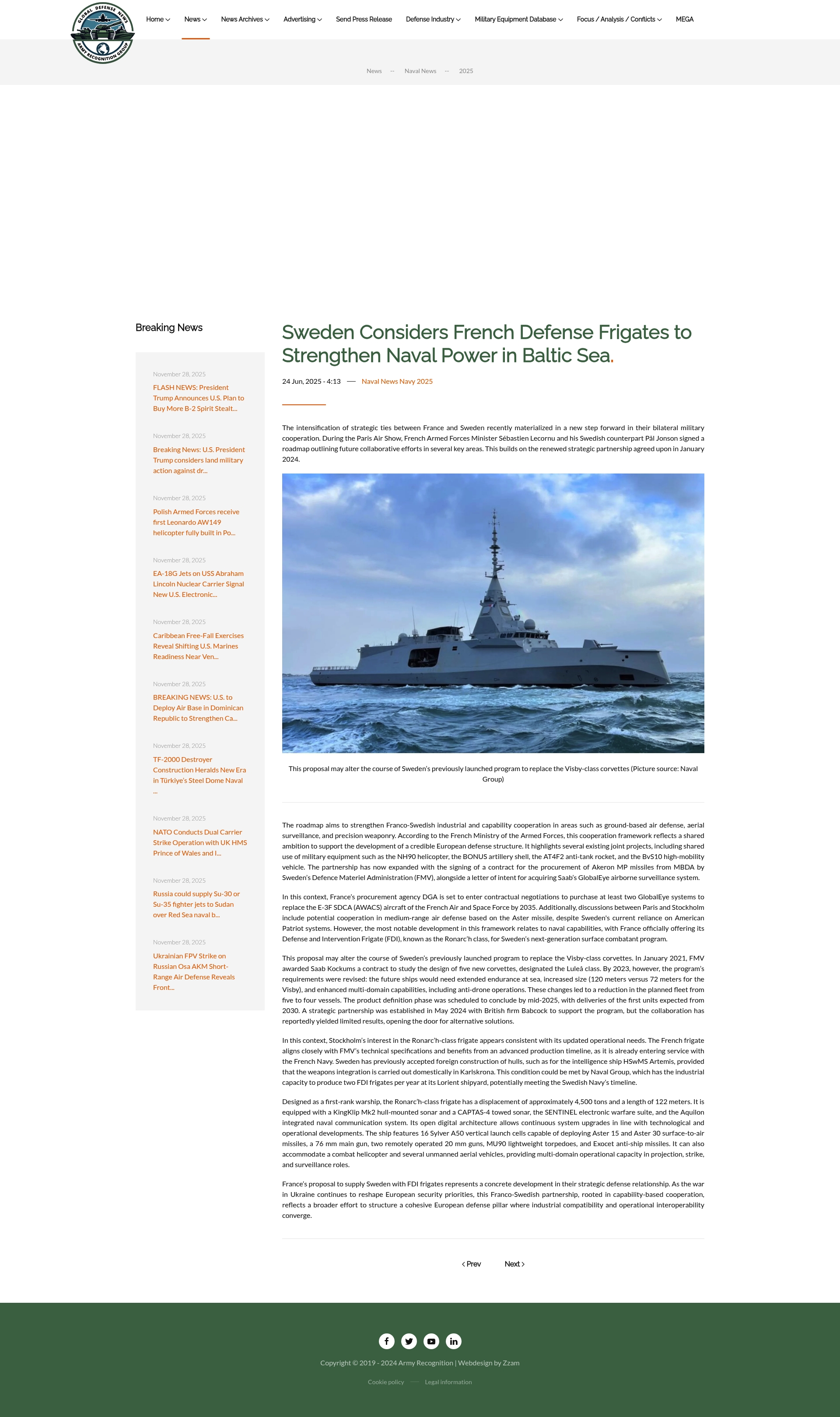 On June 24, 2025, it was reported that Sweden is considering the procurement of French Defense and Intervention Frigates (FDI), also known as the Ronarc'h Class, to strengthen its naval power in the Baltic Sea. The move is part of a broader Franco-Swedish bilateral military cooperation aiming to enhance industrial and capability cooperation in defense domains including air, precision weaponry, and sea capabilities. The French Navy’s proposed FDI frigates are advanced, designed with modern multi-domain operational capabilities, including anti-air and anti-submarine features, and integrate cutting-edge technology such as sonar systems, electronic warfare suites, and various missile and gun armaments. This initiative follows revised plans to reduce the originally intended Visby-class corvette fleet from five to four vessels and marks a continuation of joint European defense projects aimed at enhancing interoperability and industrial cooperation. The partnership, building on an earlier 2024 agreement and collaborative projects, reflects shifting European security priorities amid the ongoing war in Ukraine and is expected to contribute to a credible European defense structure.