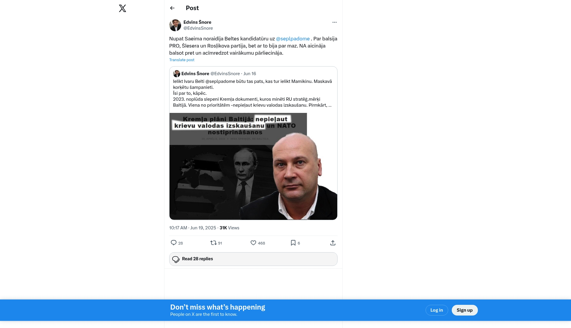 On June 19, 2025, Edvins Šnore posted on X about the Saeima nominating a candidate from the Belt alliance for the European Parliament elections, referencing political parties PRO, Šlesera, and Rošļikova. The post criticizes the candidate Ivars Belte and the Kremlin's strategy in the Baltic States, citing leaked documents about Russian objectives to prevent the eradication of the Russian language in the region and NATO strengthening. The message warns against voting for the candidate, suggesting the opposition should unite to ensure a majority to prevent Kremlin influence.