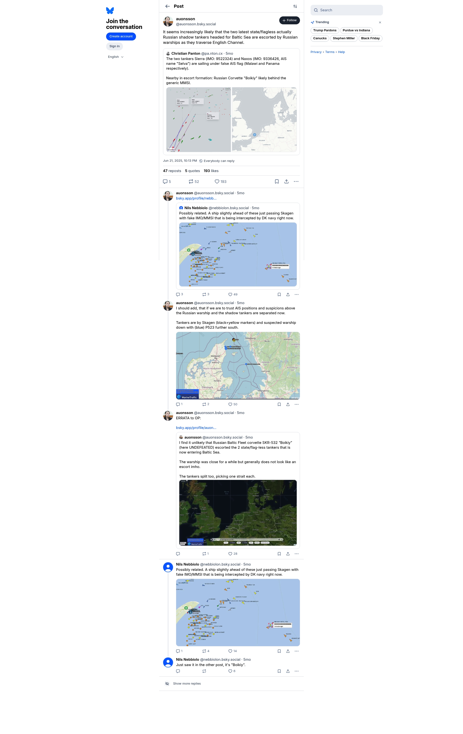 Two state/flagless tankers, actually Russian shadow tankers sailing under false AIS flags (Malawi and Panama), are headed for the Baltic Sea and appear to be escorted by a Russian warship as they traverse the English Channel. The warship, likely Russian Corvette 'Boikiy', was close to the tankers but did not maintain a consistent escort pattern. The tankers split to navigate separate straits as they enter the Baltic Sea. This movement is observed alongside suspicious AIS data and reports of a ship with fake IMO/MMSI being intercepted by the Danish navy near Skagen.