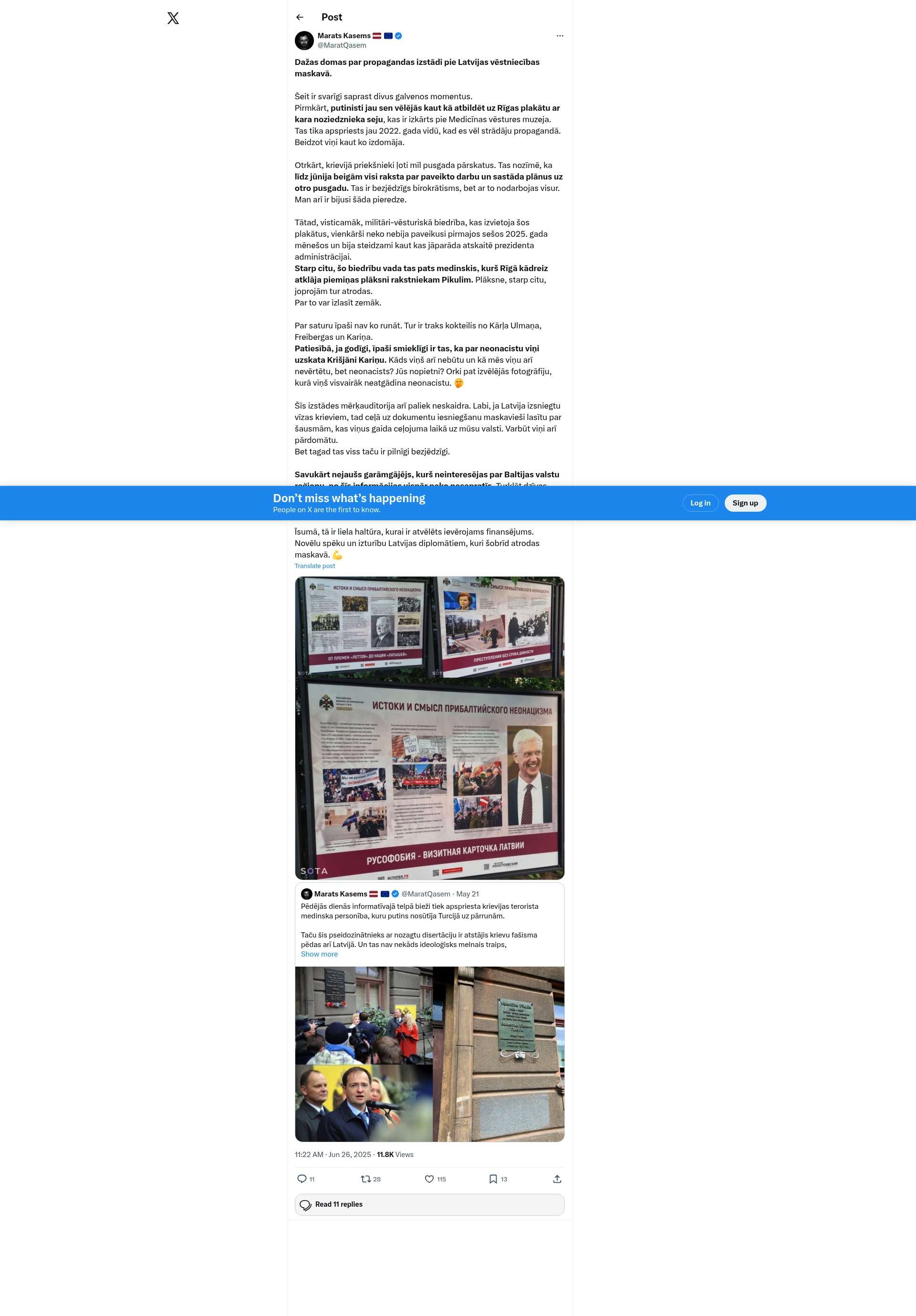 On June 26, 2025, Marats Kasems posted critical analysis of a propaganda exhibition hosted at the Latvian Embassy in Moscow. The exhibition featured biased and manipulated historical narratives accusing Latvia of neo-Nazism, with misleading references to Latvian figures such as Kārlis Ulmanis and Kristiāns Kariņš. The exhibition appears to be designed to influence Russian perspectives on the Baltic states, targeting Russian visitors including those awaiting visas in Moscow. The post calls attention to propaganda tactics and requests Latvian diplomats in Moscow to monitor the exhibition.