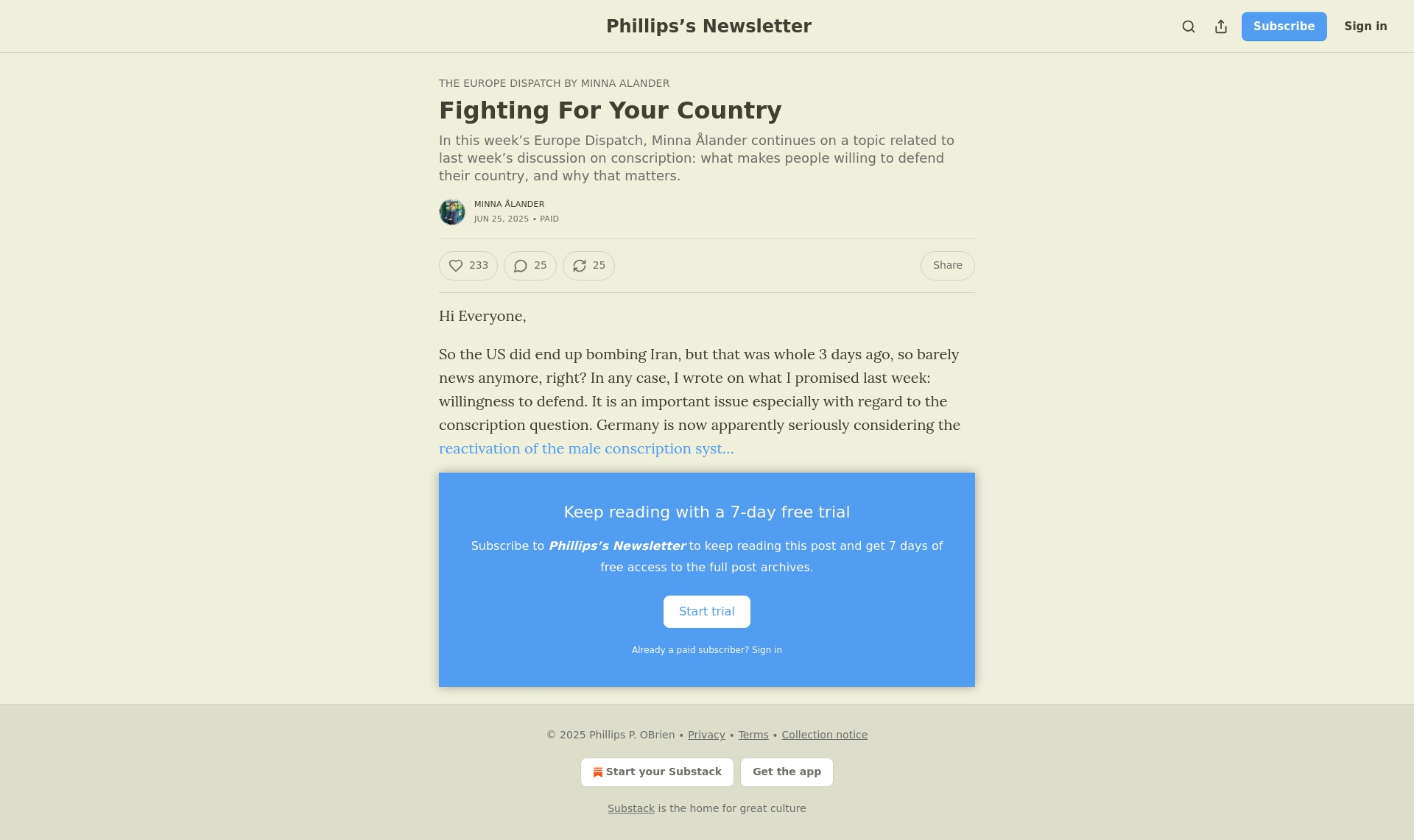 An analysis article by Minna Ålander discussing people's willingness to defend their country in the context of conscription, referencing recent US bombing in Iran and Germany's consideration of reactivating male conscription. Published on June 25, 2025, the article explores the importance of willingness to defend amid potential military drafts. Full content requires subscription.