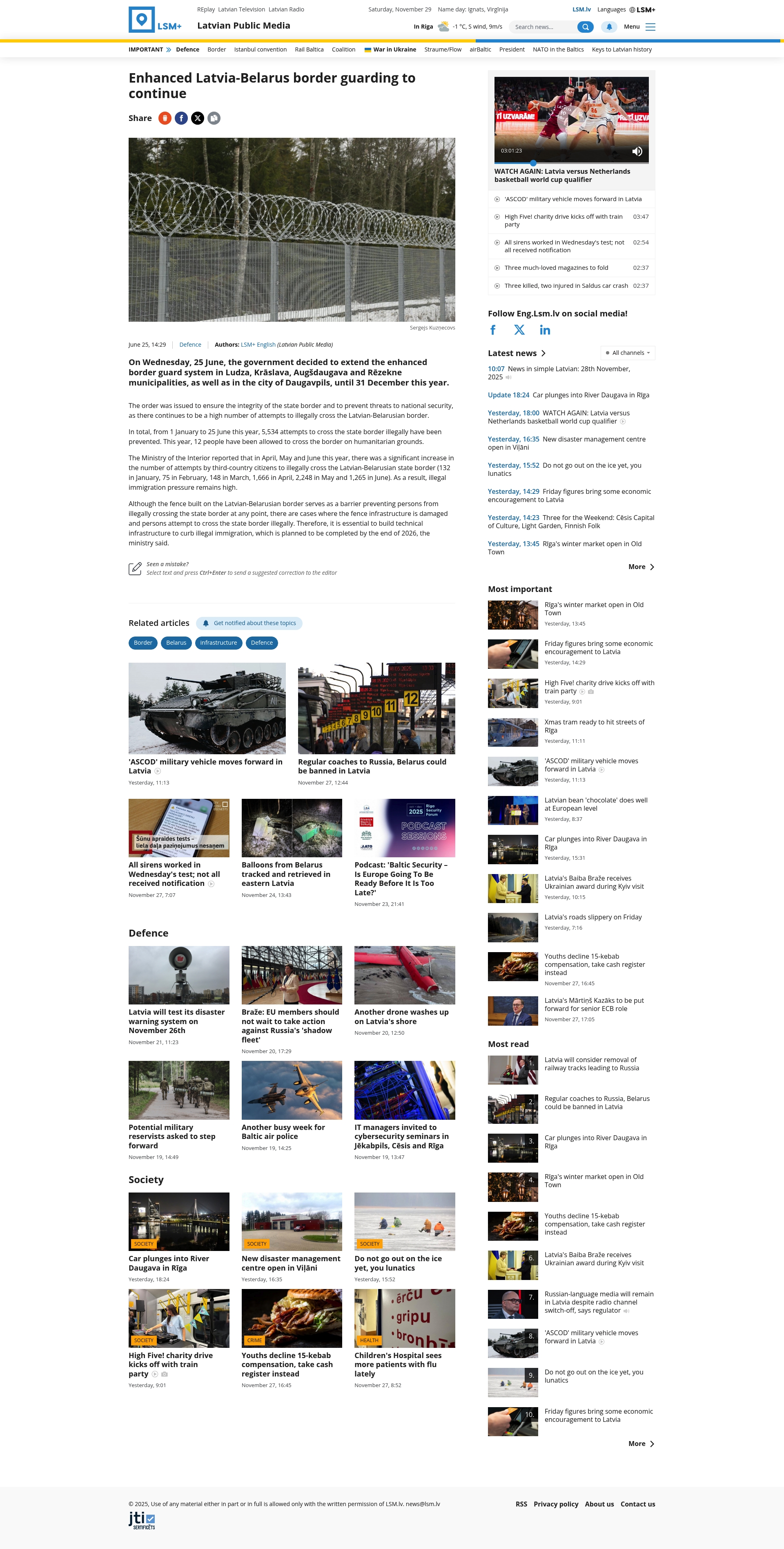 On June 25, 2025, the Latvian government decided to extend the enhanced border guard system along the Latvia-Belarus border, including Ludza, Krāslava, Augšdaugava, Rēzekne municipalities, and the city of Daugavpils, until December 31, 2025. This system aims to protect the integrity of the state border and prevent illegal crossings amid a significant number of attempts from Belarus. Since January 1, 2025, 5,534 illegal crossing attempts have been blocked, with only 12 people allowed to cross for humanitarian reasons. The Ministry of the Interior noted increased illegal crossings by third-country citizens in early 2025 and emphasized the importance of maintaining and upgrading border infrastructure, including plans to complete technical upgrades to curb illegal immigration by the end of 2026.