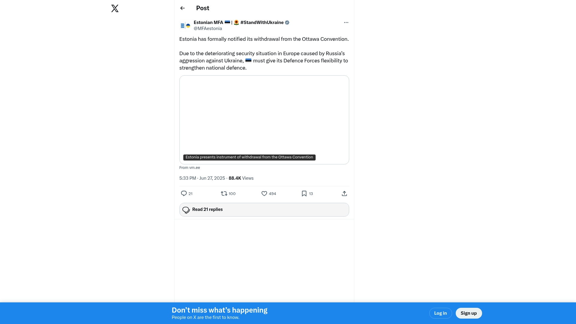 Estonia has formally notified its withdrawal from the Ottawa Convention. The withdrawal is driven by deteriorating security in Europe caused by Russia’s aggression against Ukraine, which Estonia states necessitates giving its Defence Forces greater flexibility to strengthen national defence.