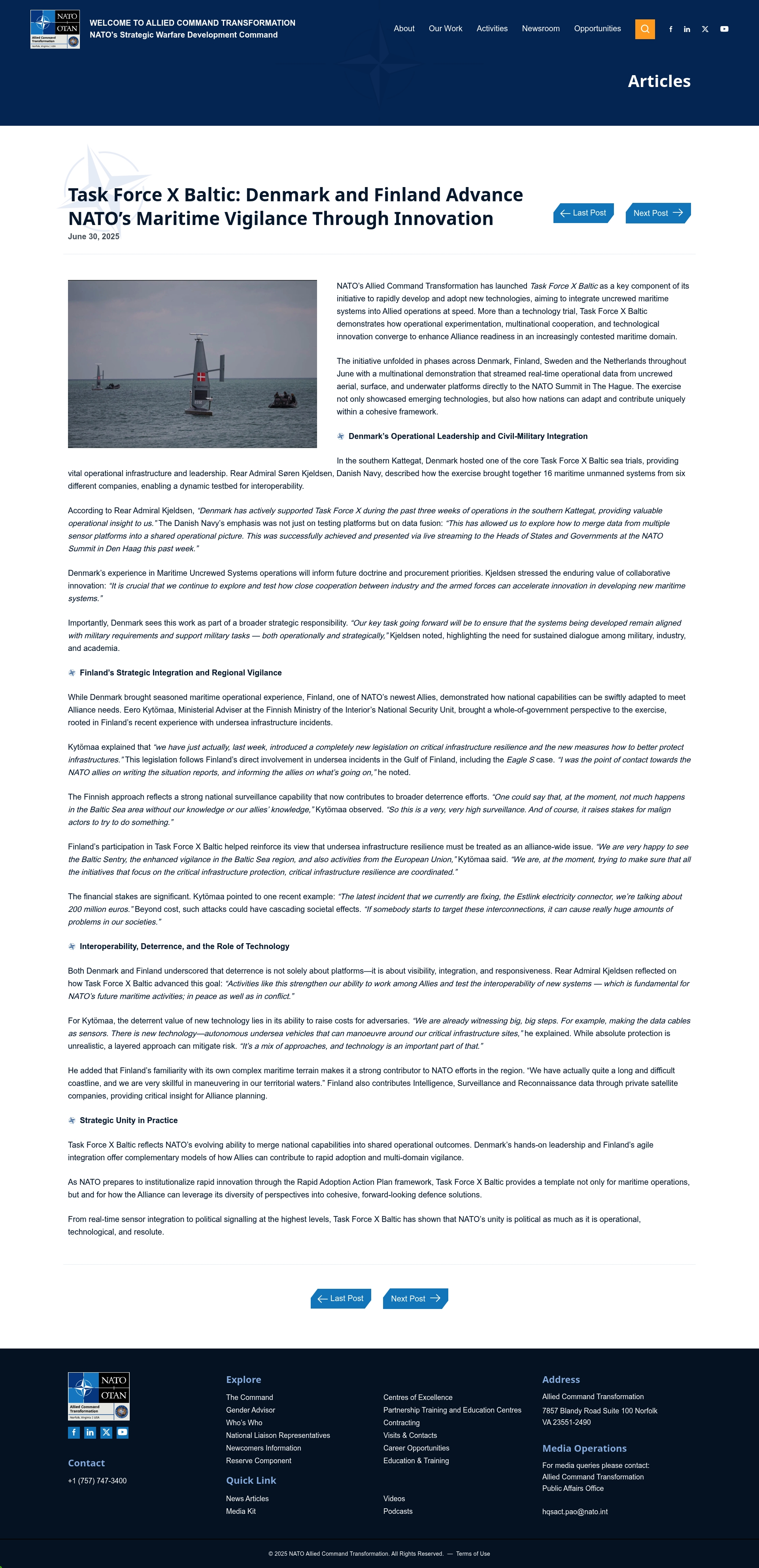 Short Summary: NATO’s Task Force X Baltic, led by Denmark and Finland, advances maritime vigilance through integrating uncrewed systems and fostering innovation in June 2025 exercises across multiple Baltic countries.