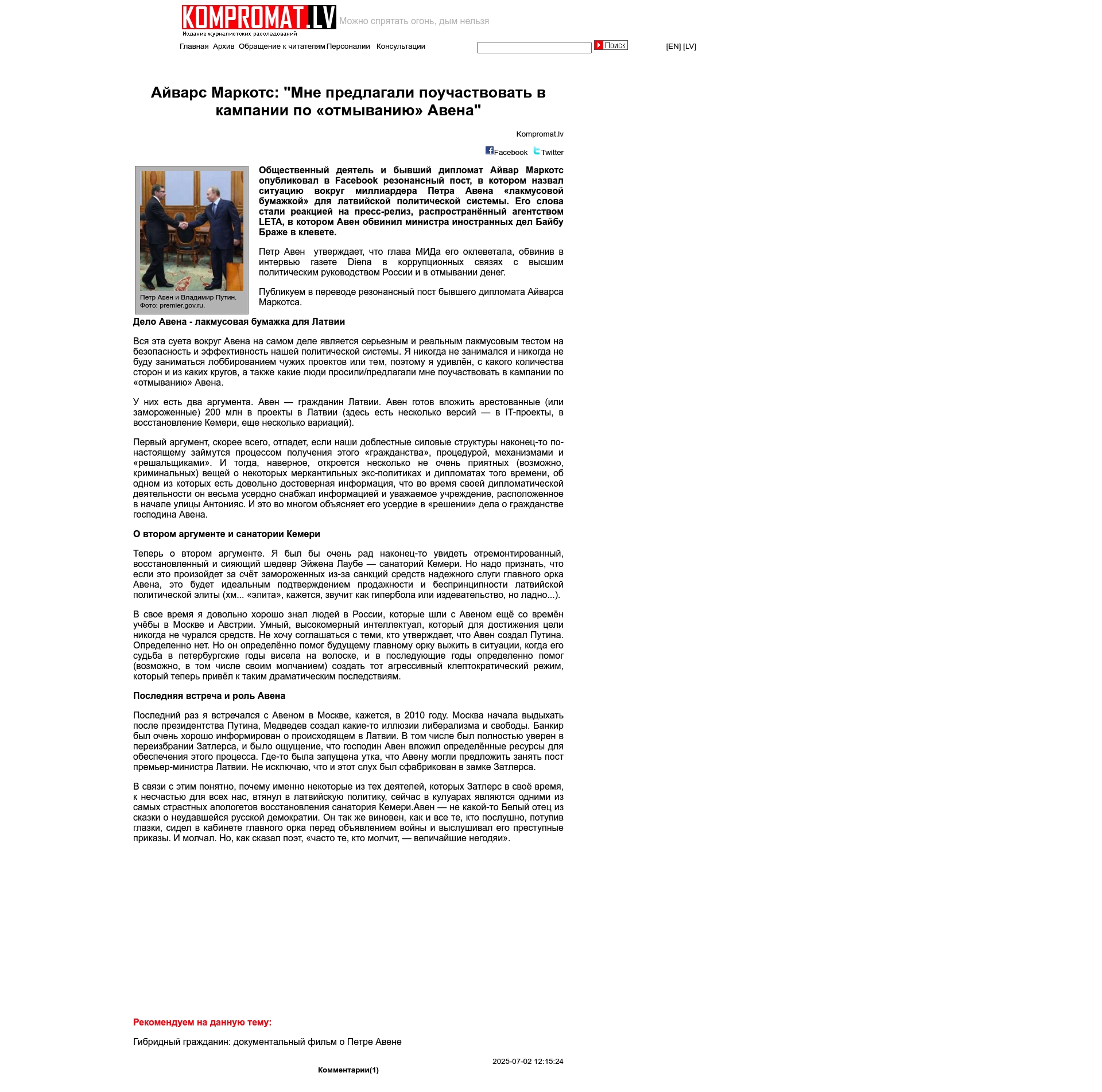 Public figure and former diplomat Aivars Markots published a resonant post on Facebook addressing the controversy surrounding billionaire Petr Aven, labeling the situation a 'scam paper' for Latvia's political system. Markots reacted to a LETA news agency report where Aven accused the Latvian foreign minister Baiba Braže of slander. Aven denied allegations linking him to corruption and money laundering connected to Russian political leadership. Markots exposed attempts and propositions for him to participate in Aven's alleged money laundering campaign, emphasizing the serious nature of the case for Latvia's security and political integrity. He criticized the Latvian political elite and highlighted disputes about Aven's citizenship, his proposed investments in Latvia related to frozen funds, and the controversial restoration of the Kemeri sanatorium. The post references historical and political contexts including Aven's meetings and influence in Moscow and Latvian politics.