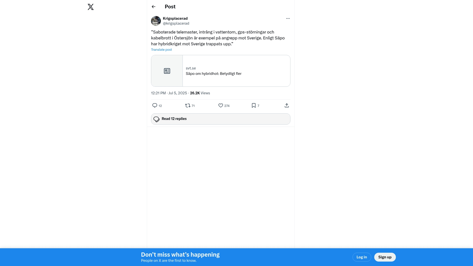 A post reports that sabotage of telecommunication masts, intrusion into water towers, GPS jamming, and cable breaks in the Baltic Sea are examples of attacks against Sweden. According to Säpo (Swedish Security Service), the hybrid war against Sweden has escalated.