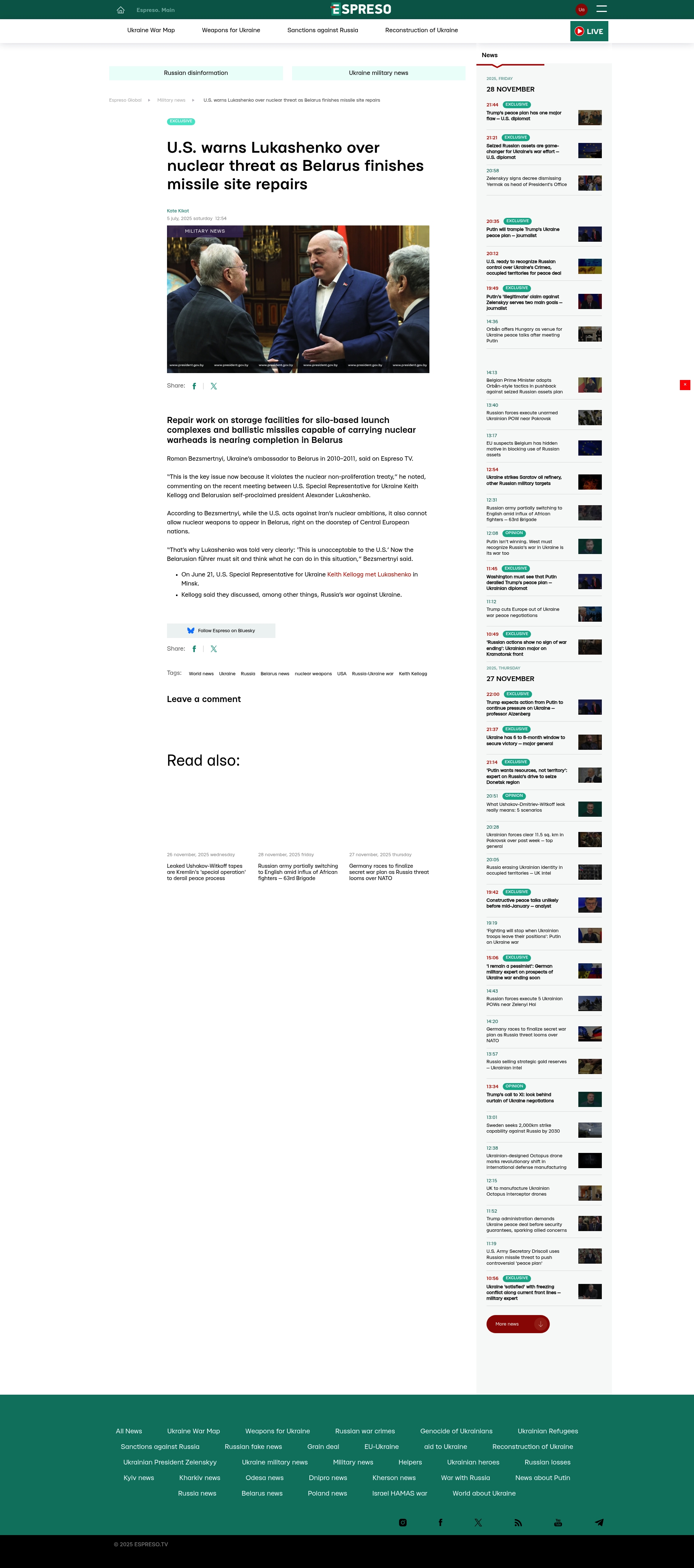 URL:https://global.espreso.tv/military-news-us-warns-lukashenko-over-nuclear-threat-as-belarus-finishes-missile-site-repairs🔗Archive:Archived HTML