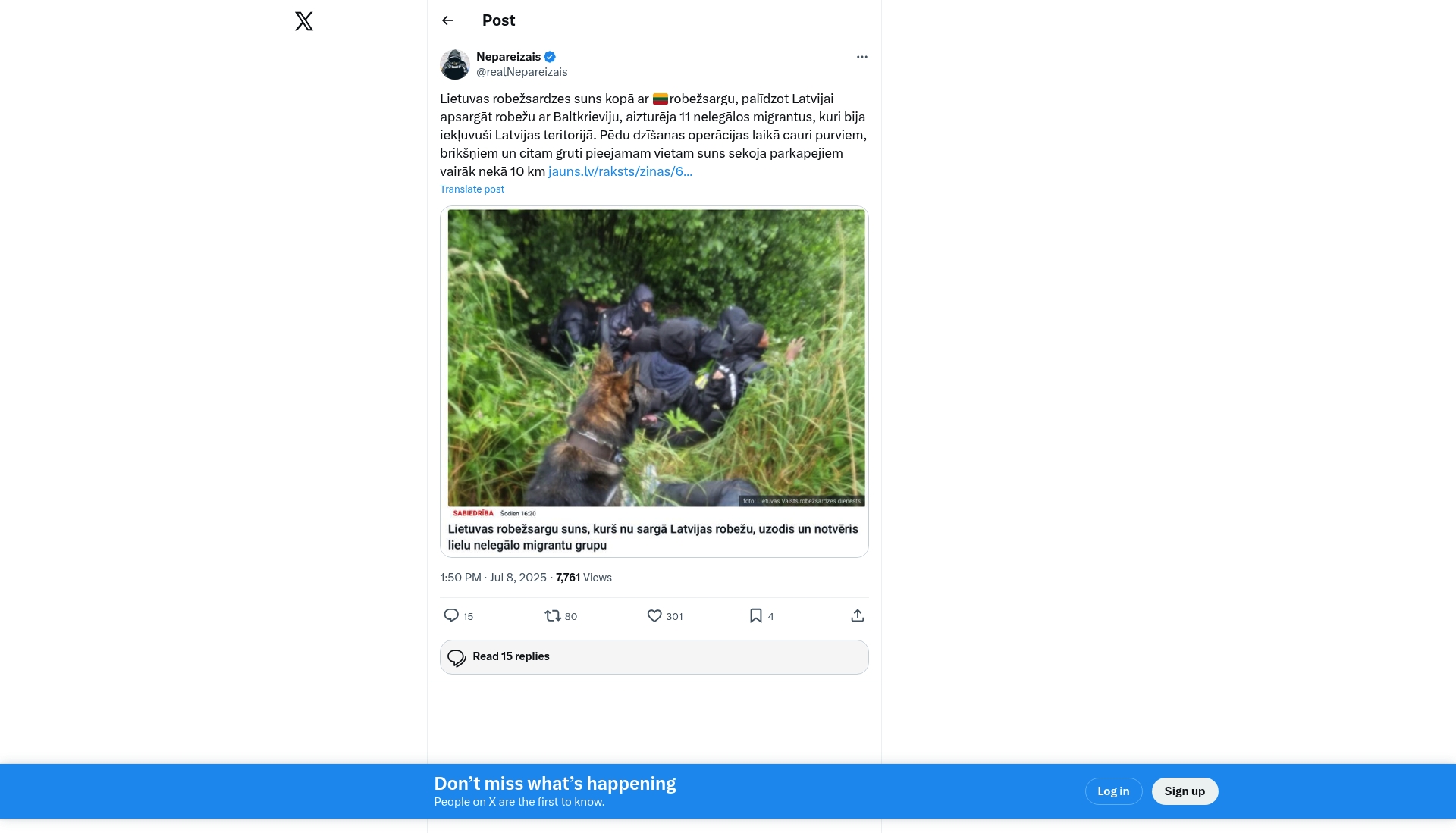 A Lithuanian border guard dog, working alongside Latvian border guards, interrupted and dispersed a group of 11 illegal migrants who had crossed into Latvia. The dog tracked the trespassers through difficult terrain, including swamps and briars, covering distances greater than 10 km during the pursuit.