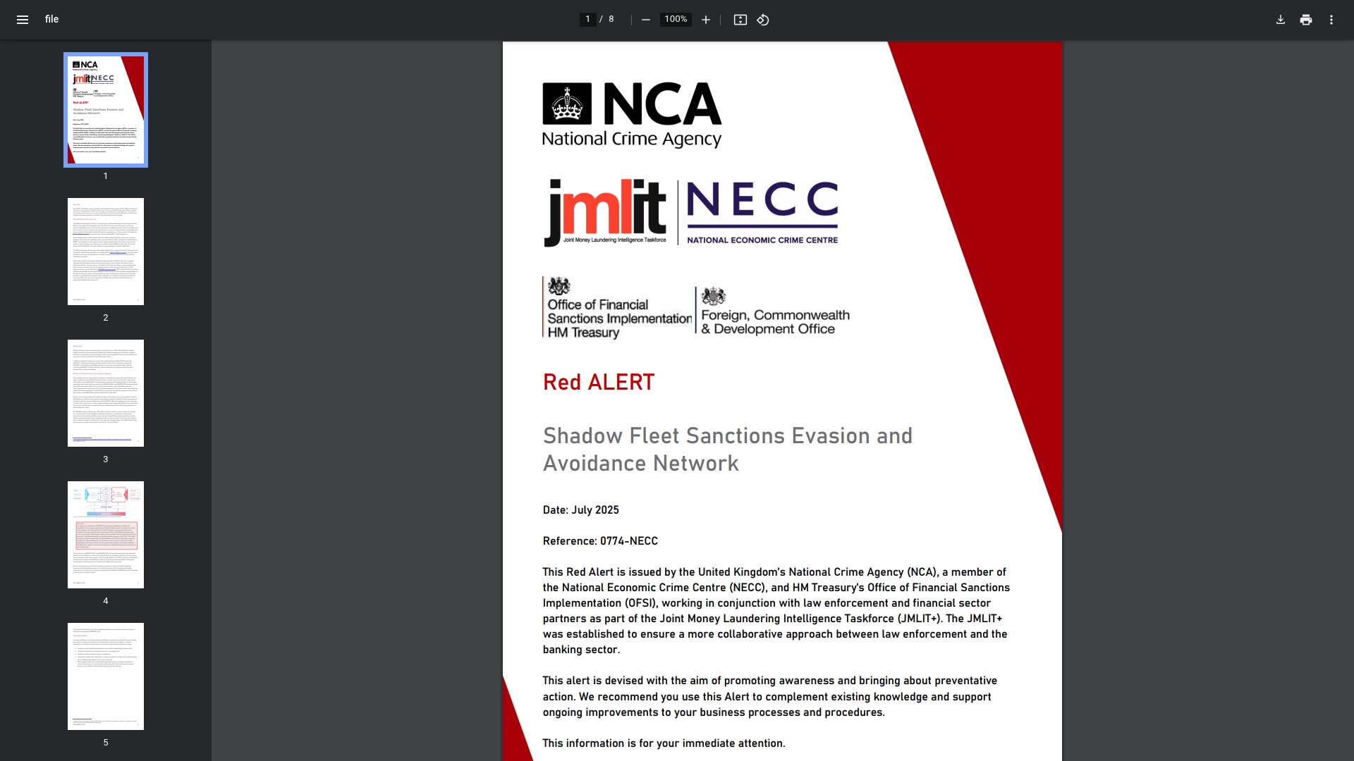 In July 2025, the UK's National Crime Agency (NCA), as part of the National Economic Crime Centre (NECC) and working with HM Treasury's Office of Financial Sanctions Implementation (OFSI), issued a Red Alert on a 'Shadow Fleet' network involved in sanctions evasion and avoidance. This network manipulates maritime operations to circumvent international sanctions, particularly targeting those imposed on Russia, using deceptive ship identities, transshipment tactics, and falsified documentation to obscure ownership and vessel movements. The alert aims to raise awareness among maritime industry stakeholders and financial institutions to improve detection and prevention efforts against the illicit activities of this shadow fleet, highlighting the importance of collaborative law enforcement and financial sector responses.