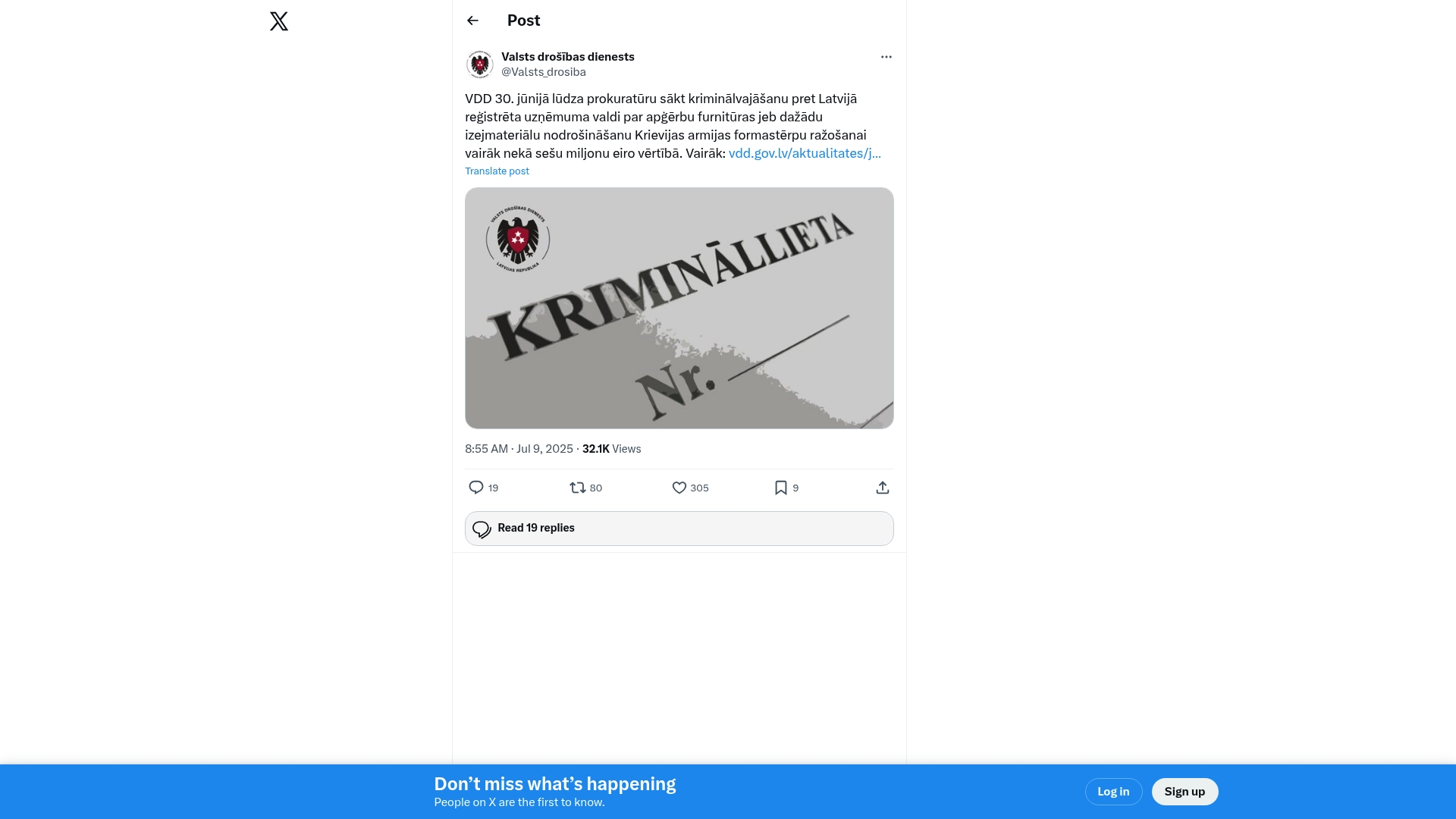 On June 30, 2025, Latvia's State Security Service (VDD) requested the prosecution to initiate a criminal case against the management of a Latvia-registered company. The company is accused of supplying clothing furniture and various materials valued at over six million euros for the production of uniform items for the Russian army's formations.