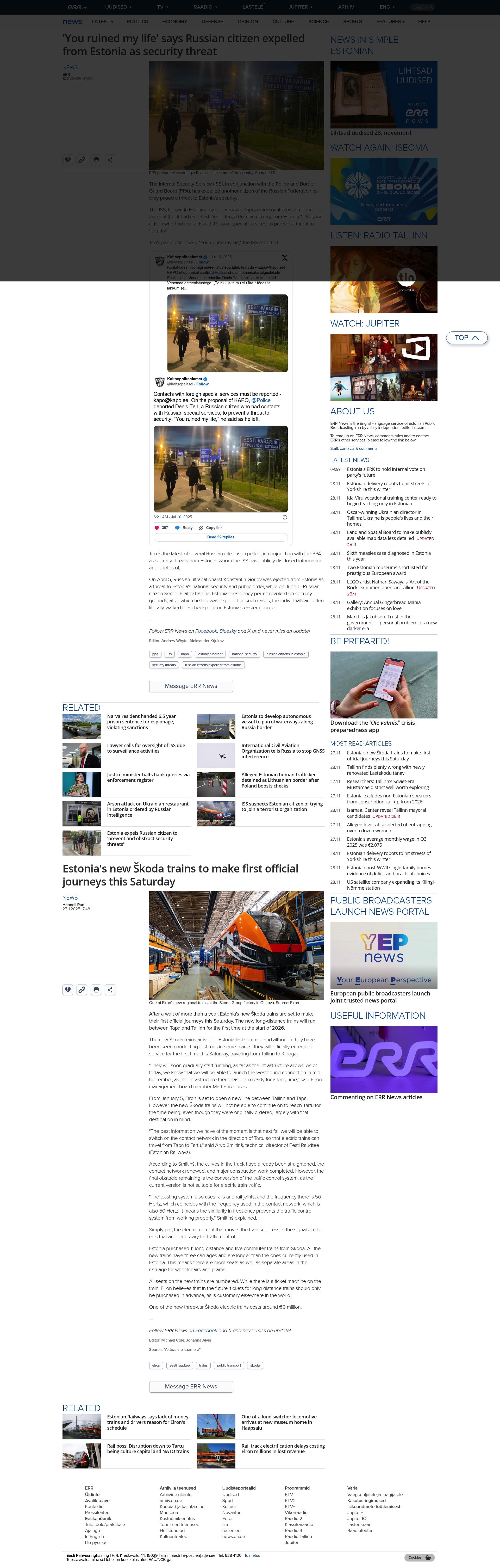 Estonia's Internal Security Service (ISS) and Police and Border Guard Board (PPA) expelled a Russian citizen deemed a security threat. The individual accused Estonia of ruining his life. The ISS described the person as a known threat and confirmed the expulsion was connected to national security concerns. No detailed information about the specific threat was publicly disclosed.