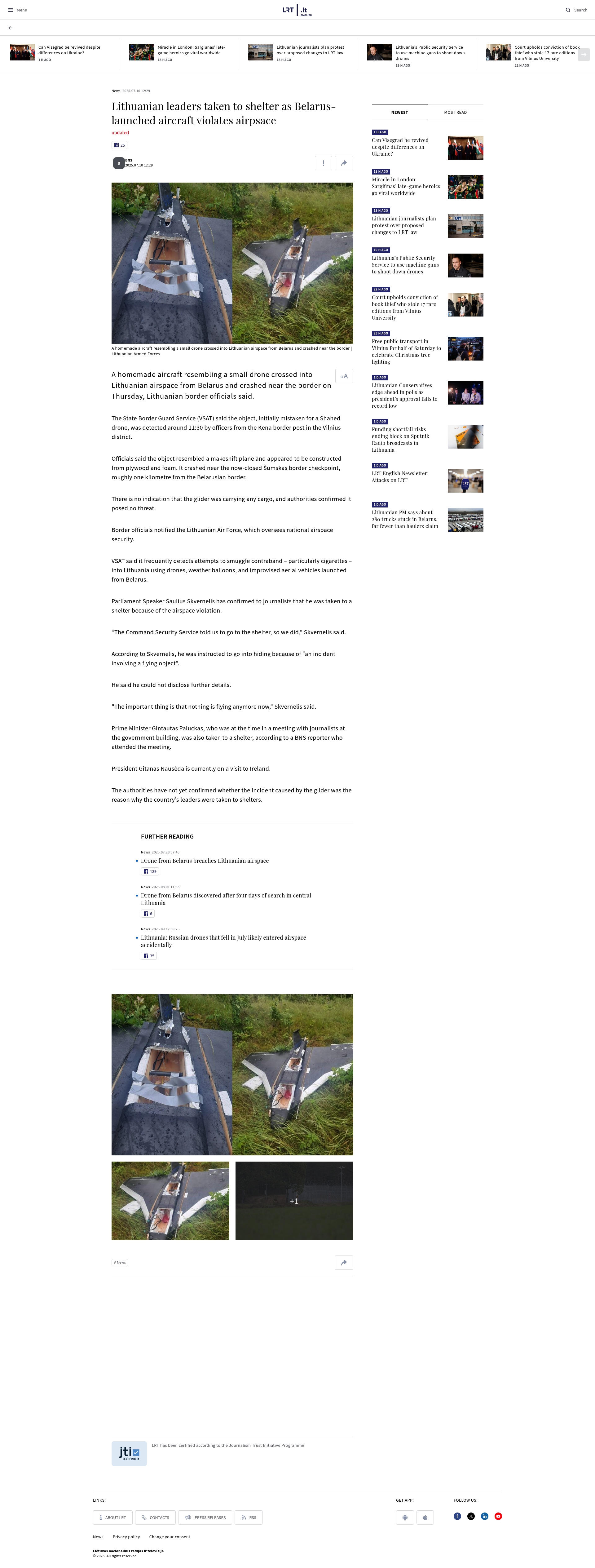 A homemade aircraft resembling a small drone crossed into Lithuanian airspace from Belarus and crashed near the border on Thursday. The State Border Guard Service detected the object which was initially mistaken for a Shahed drone. Lithuanian leaders, including the Parliament Speaker and Prime Minister, were taken to shelters during the incident. The origin glider appeared constructed from plywood and foam, confirmed as posing no threat by authorities. The incident caused heightened tensions along the Lithuania-Belarus border with ongoing airspace security concerns.
