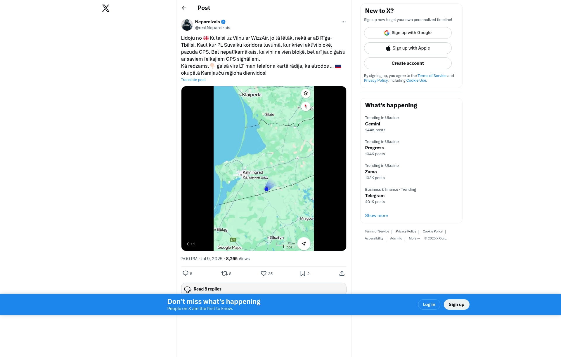A Twitter user reports GPS signal interference and spoofing near the Poland-Suvalki corridor close to the Russian-occupied Kaliningrad region's southeastern border. The incident was detected en route from Kutaisi to Vilnius on WizzAir, indicating disrupted navigation signals in a sensitive border area. The user underscores deceptive GPS signaling by unclear actors in this area, which is close to Russian forces.