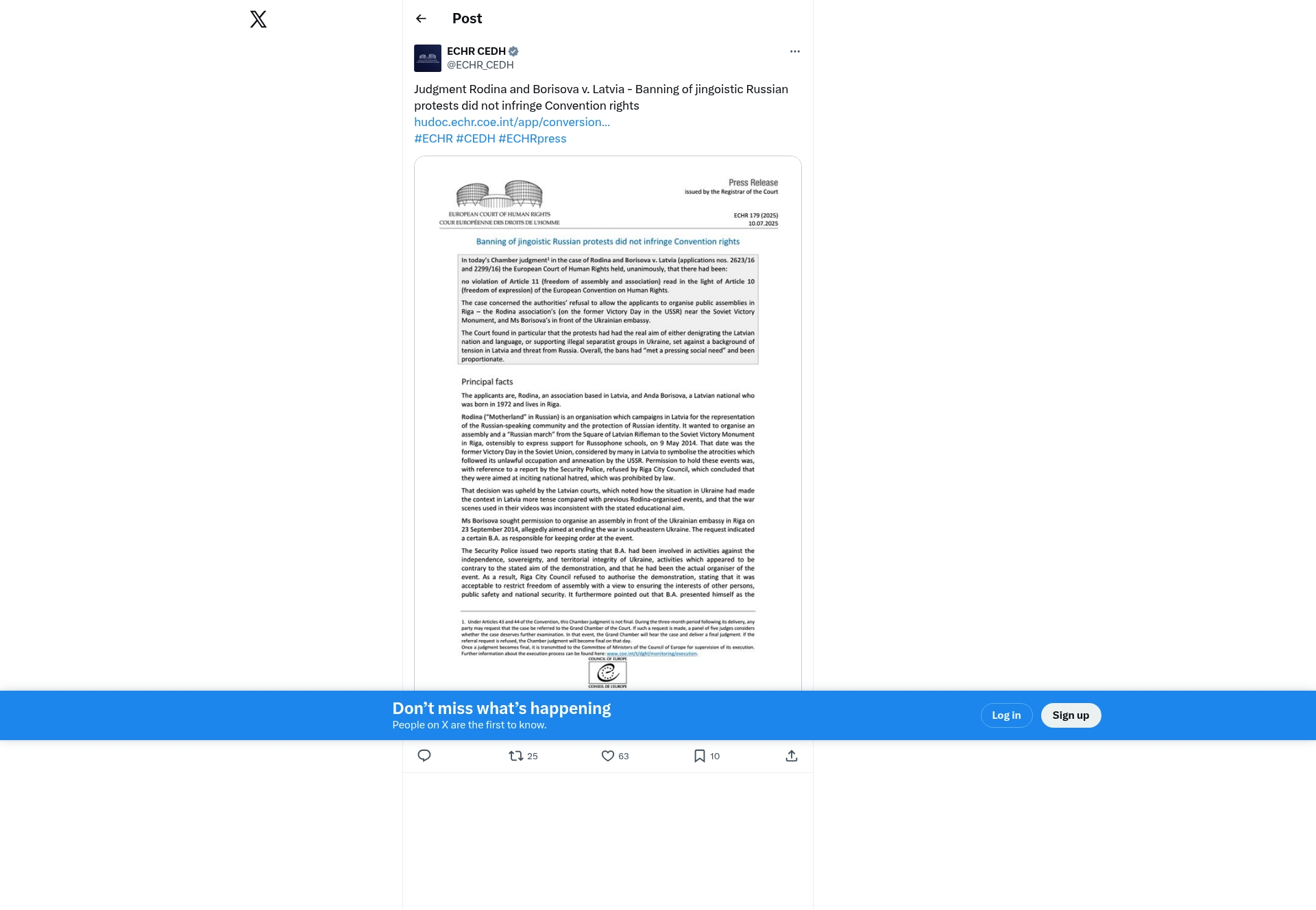 The European Court of Human Rights (ECHR) issued a judgment in the case of Rodina and Borisova v. Latvia, ruling that the banning of jingoistic Russian protests in Riga did not infringe on Convention rights. The court found no violation of Article 11 (freedom of assembly and association) and Article 10 (freedom of expression) of the European Convention on Human Rights. The protests were banned because they were deemed to denigrate Latvian nation and language, support illegal separatist groups in Ukraine, and occurred against a tense background of threat from Russia. The bans were held to meet a pressing social need and were proportionate.