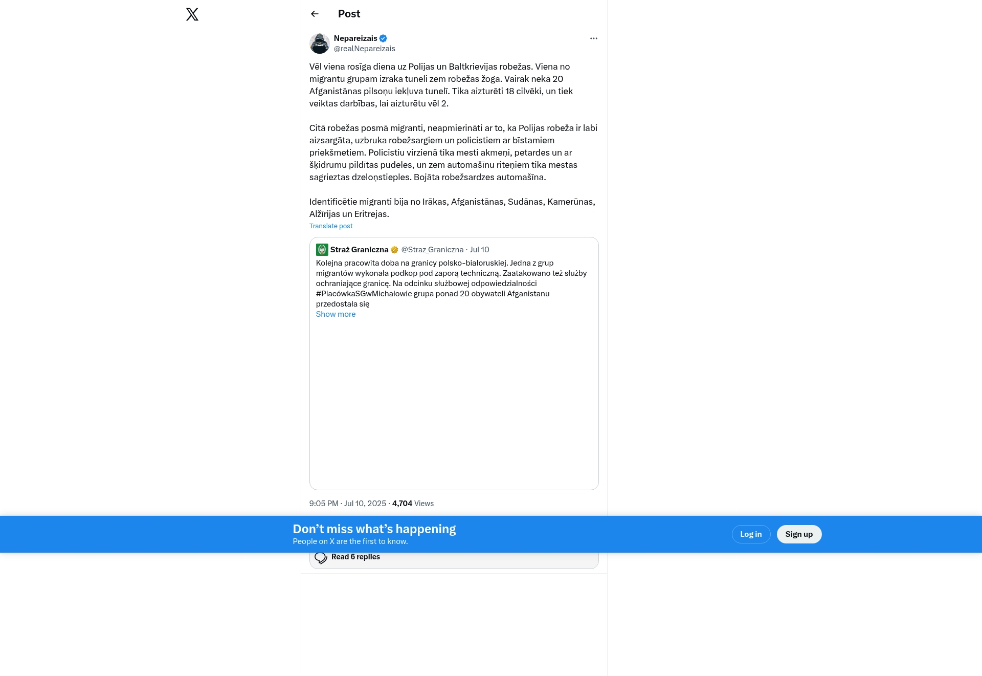 On July 10, 2025, near the Poland-Belarus border, a migrant group dug tunnels under the border fence. More than 20 Afghan citizens entered through the tunnel; 18 were arrested, with operations ongoing to detain 2 more. Elsewhere along the border, migrants attacked Polish border guards and police with stones, firecrackers, and bottles filled with liquid. They also threw railroad spikes under police cars, damaging border guard vehicles. Identified migrants included nationals from Iraq, Afghanistan, Sudan, Cameroon, Algeria, and Eritrea.