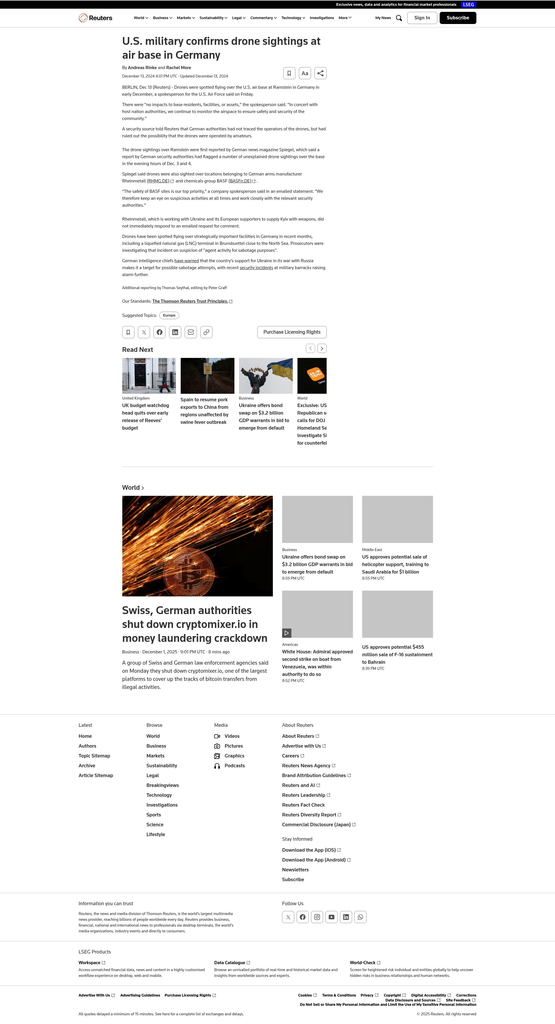 In early December 2024, unidentified drones were sighted flying over the U.S. air base at Ramstein in Germany. The U.S. Air Force confirmed the sightings, stating there were no impacts to base residents, facilities, or assets. German authorities had not traced the operators but ruled out amateur use. Additional drone sightings occurred over locations of German arms manufacturer Rheinmetall and chemicals group BASF. German intelligence cited concerns that such incidents may represent sabotage attempts linked to the country's support for Ukraine in the war with Russia.