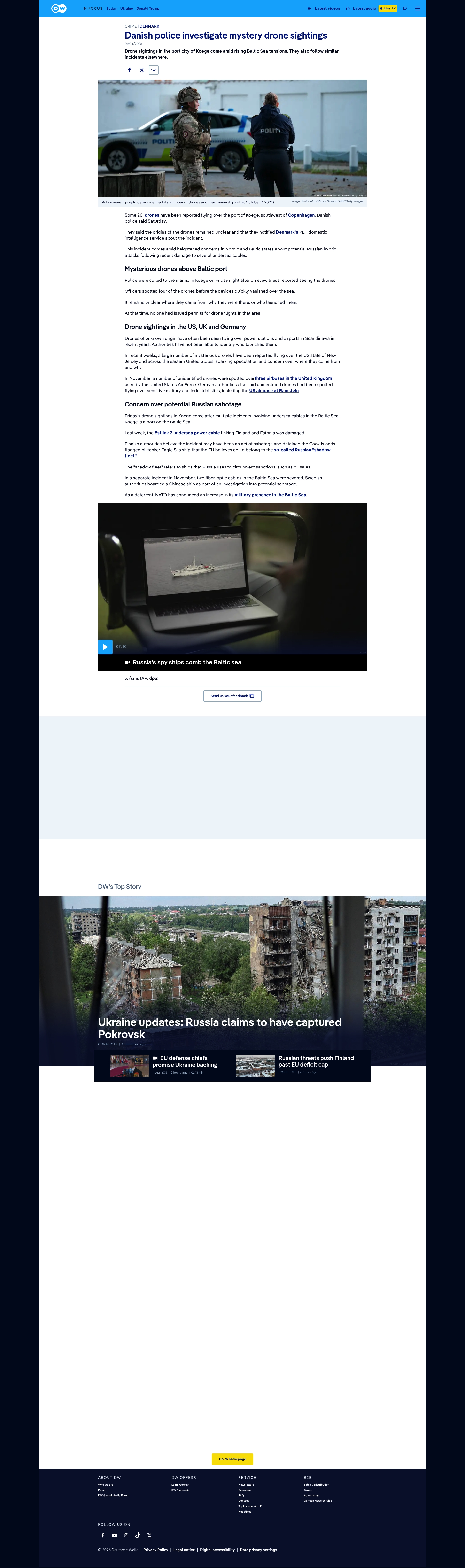 "description": "Danish police are investigating reports of mystery drone sightings around the port city of Koege and near the Baltic Sea stations. The origin and purpose of these drones remain unclear, but similar sightings have been noted in the US, UK, and Germany. The alerts come amid concerns about potential Russian hybrid activities in the Baltic Sea region, including recent incidents such as undersea cable damage. Authorities have not issued any drone flight permits for the area. NATO has increased military presence in the Baltic Sea, reflecting heightened regional tensions.",