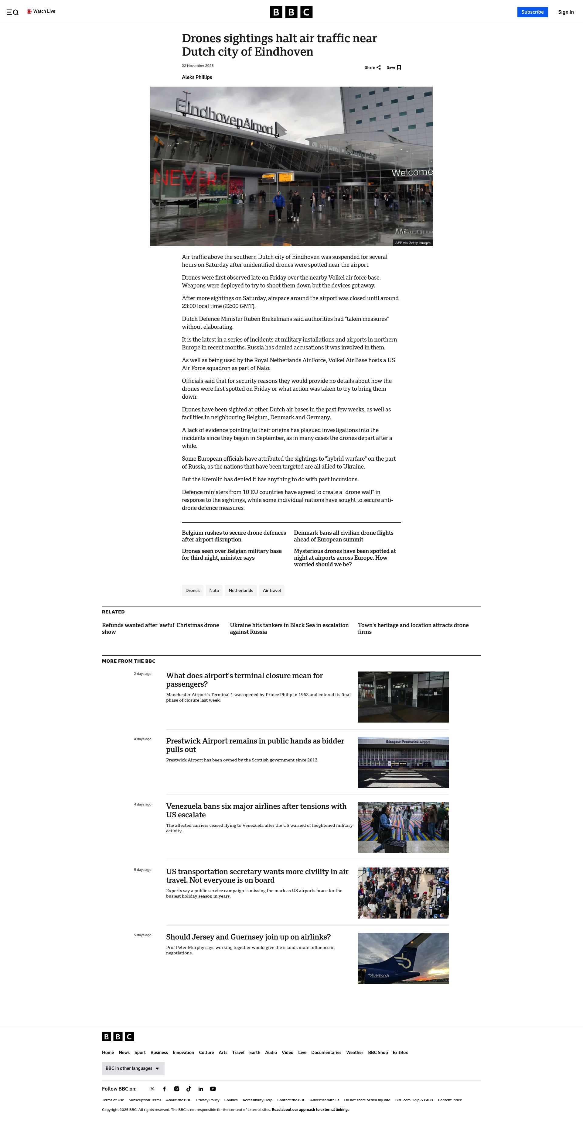 Air traffic above the southern Dutch city of Eindhoven was suspended for several hours on 22 November 2025 after unidentified drones were spotted near the airport. The first sightings occurred late on 21 November near the nearby Volkel air force base. Efforts to shoot down the drones failed as the devices escaped. The incident caused a temporary closure of the airspace around Eindhoven airport until 22:00 GMT. Authorities have not disclosed detailed measures taken. The sightings are part of a series of drone appearances near airports and military bases in northern Europe, involving multiple countries and attributed by some European officials to Russian 'hybrid warfare,' though Russia denies involvement.