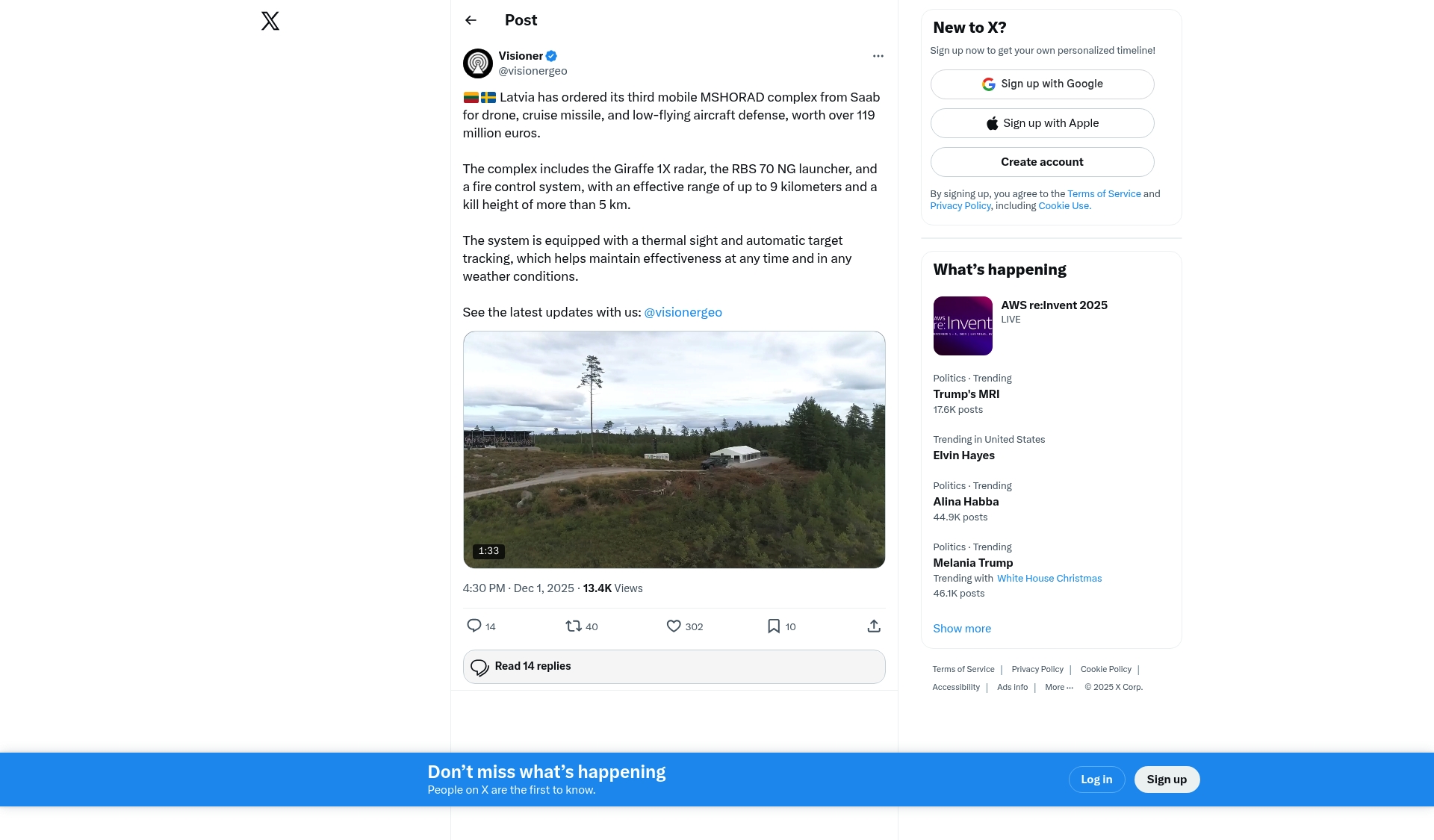 Latvia has ordered its third mobile MSHORAD complex from Saab valued at over 119 million euros to defend against drones, cruise missiles, and low-flying aircraft. The ordered complex includes the Giraffe 1X radar, the RBS 70 NG launcher, and a fire control system capable of tracking targets with thermal sight and automatic tracking, effective up to 9 kilometers range and a kill height beyond 5 km. This capability enhances Latvia's air defense against emerging aerial threats under various weather conditions.