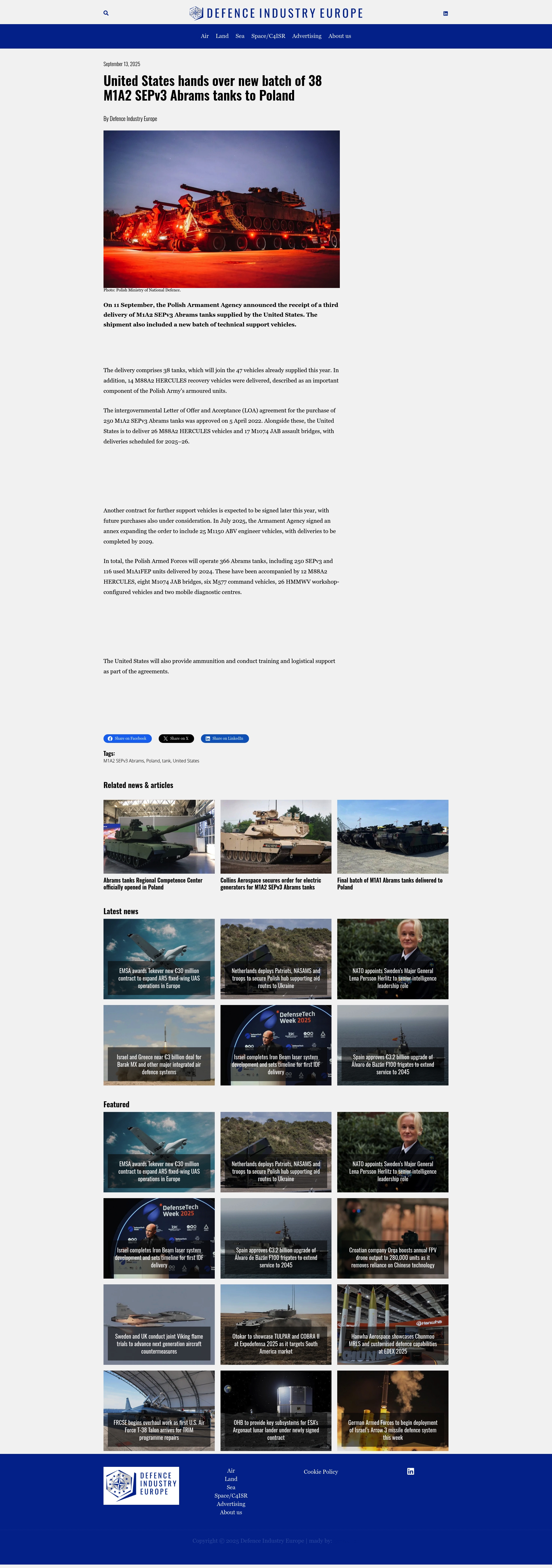 On September 11, 2025, the Polish Armament Agency announced receipt of a third delivery of 38 M1A2 SEPv3 Abrams tanks from the United States, including new technical support vehicles. This shipment adds to 47 vehicles previously delivered earlier in 2025. The US also plans deliveries of additional support vehicles and equipment through 2029. Poland will operate a total of 366 Abrams tanks, including 250 M1A2 SEPv3 and 116 used M1A1FEP units delivered by 2024, accompanied by various support vehicles and diagnostic systems. The United States will also provide ammunition, training, and logistical support under the agreements.