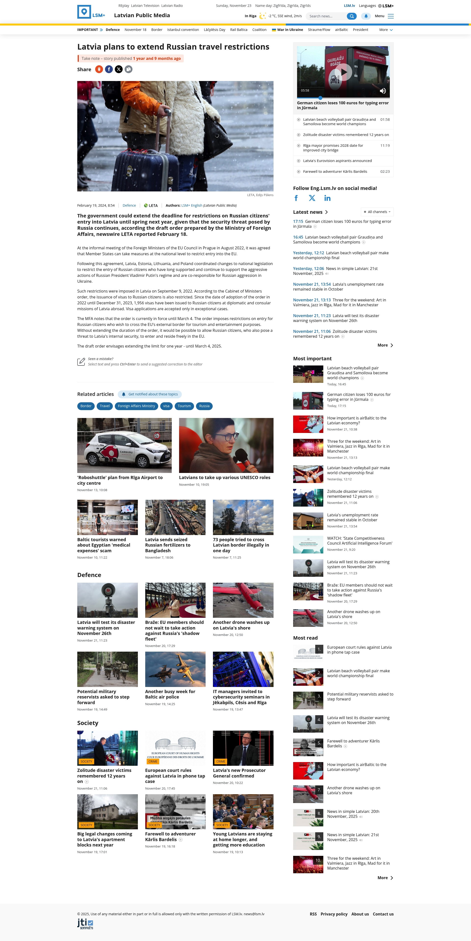 Short Summary: Latvia to extend travel restrictions on Russian citizens until at least March 4, 2025, due to ongoing security risks.