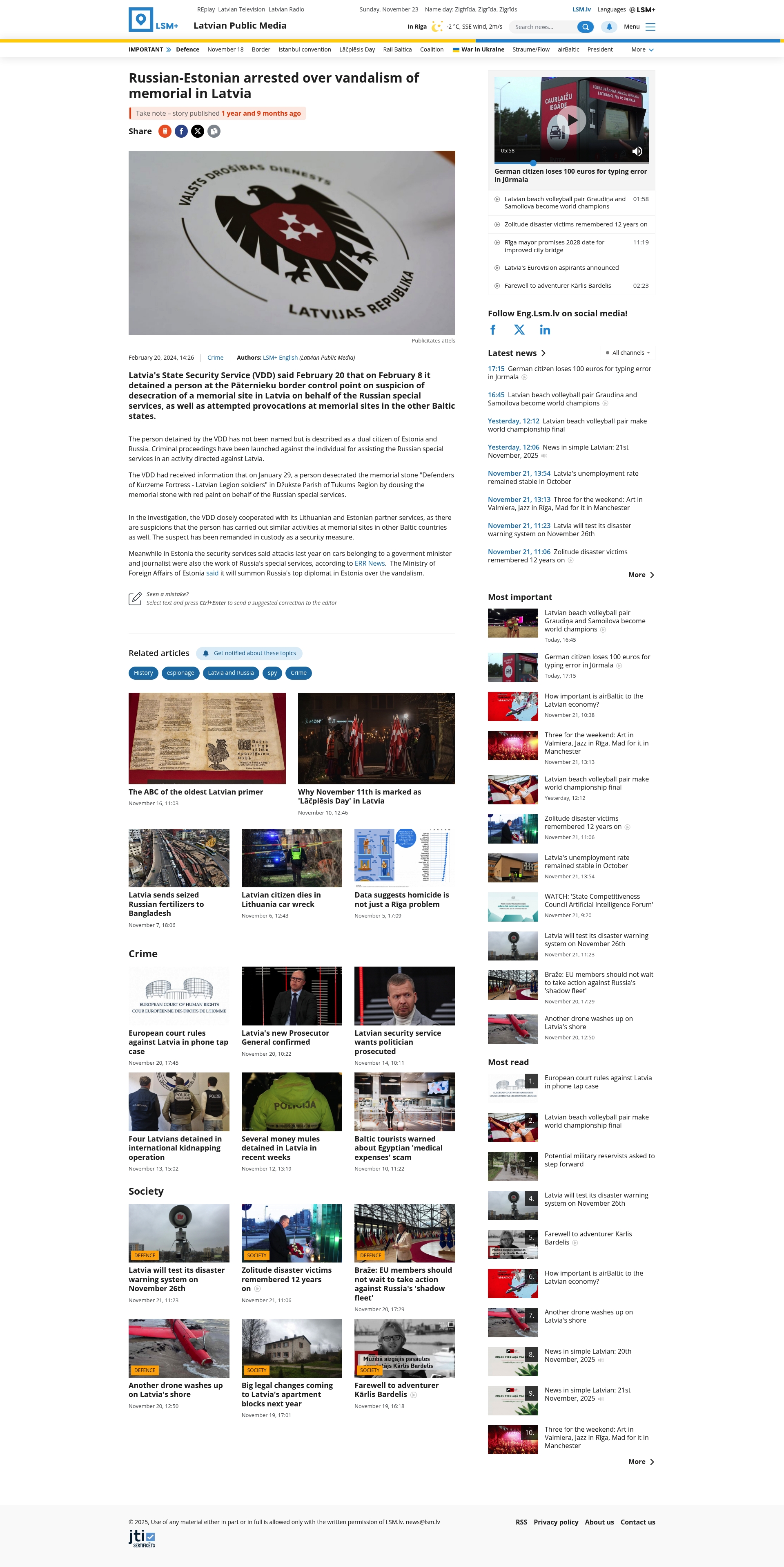 - "Latvia's State Security Service (VDD) said February 20 that on February 8 it detained a person at the Patērnieki border control point on suspicion of desecration of a memorial site in Latvia on behalf..."