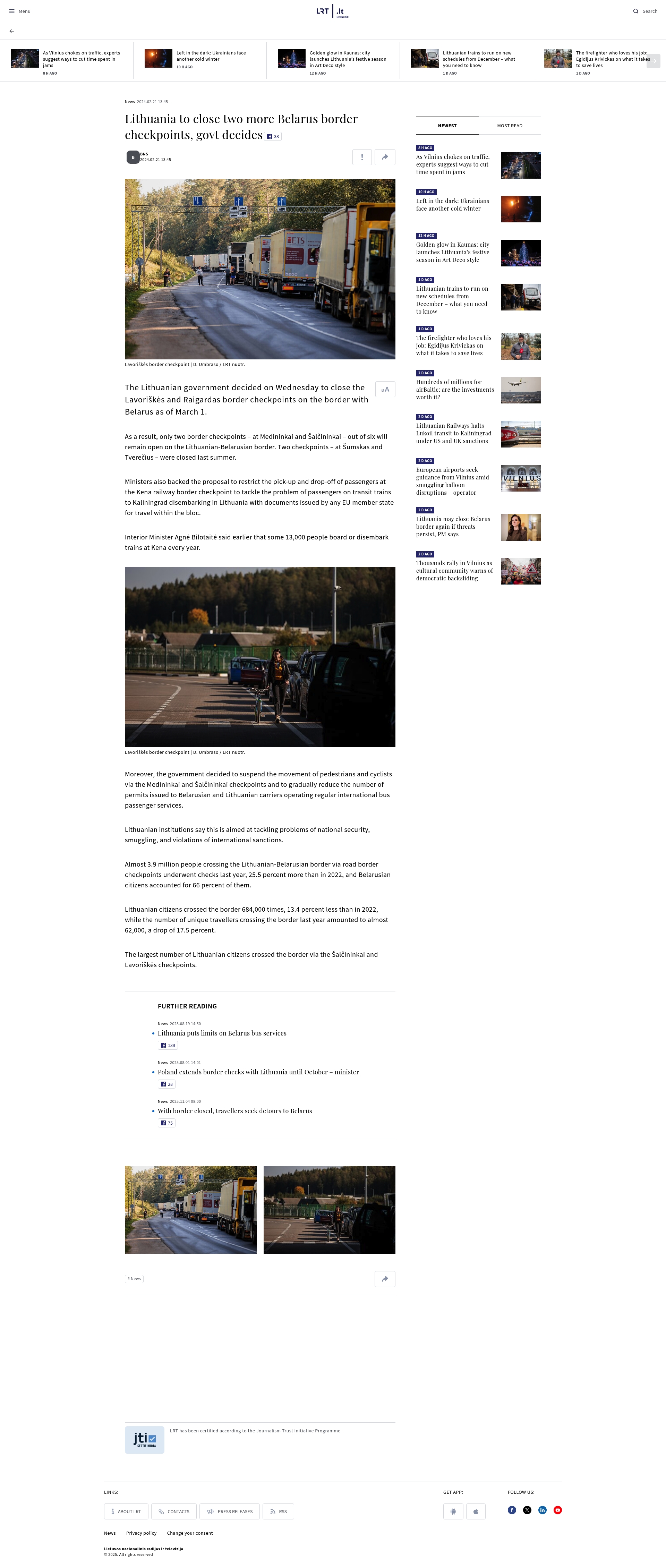 - "The Lithuanian government decided on Wednesday to close the Lavoriškės and Raigardas border checkpoints on the border with Belarus as of March 1."