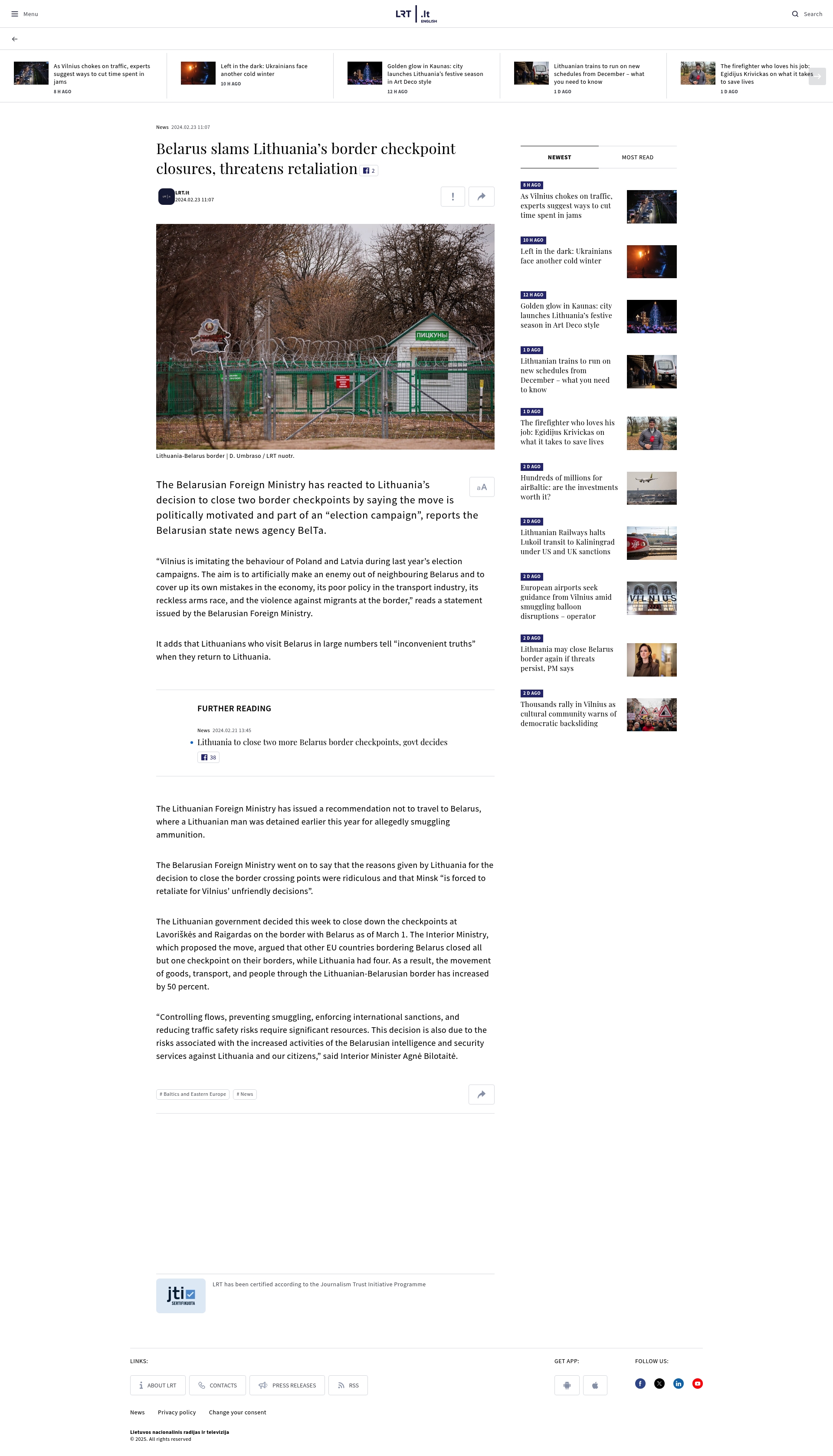 Headline: Belarus slams Lithuania’s border checkpoint closures, threatens retaliation