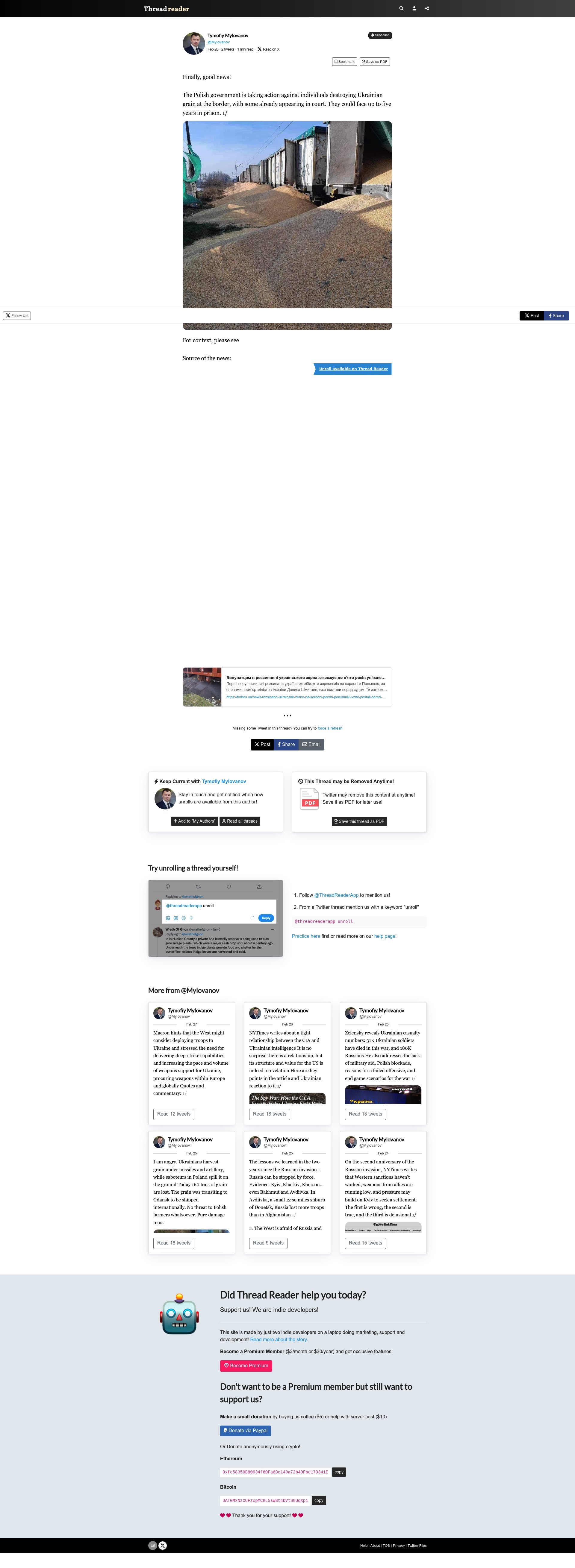 - "The Polish government is taking action against individuals destroying Ukrainian grain at the border, with some already appearing in court. They could face up to five years in prison."