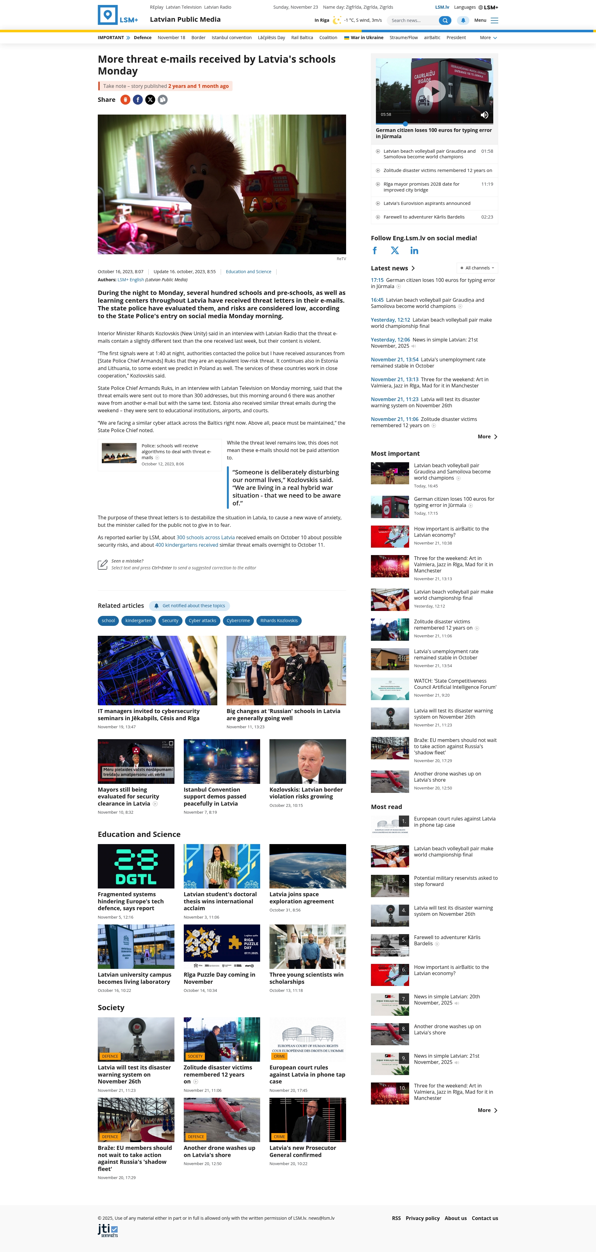 - "As recorded earlier by LSM, about 300 schools across Latvia received e-mails on October 10 about possible security risks, and by Monday, about 400 kindergartens received similar threats, arriving prim..."