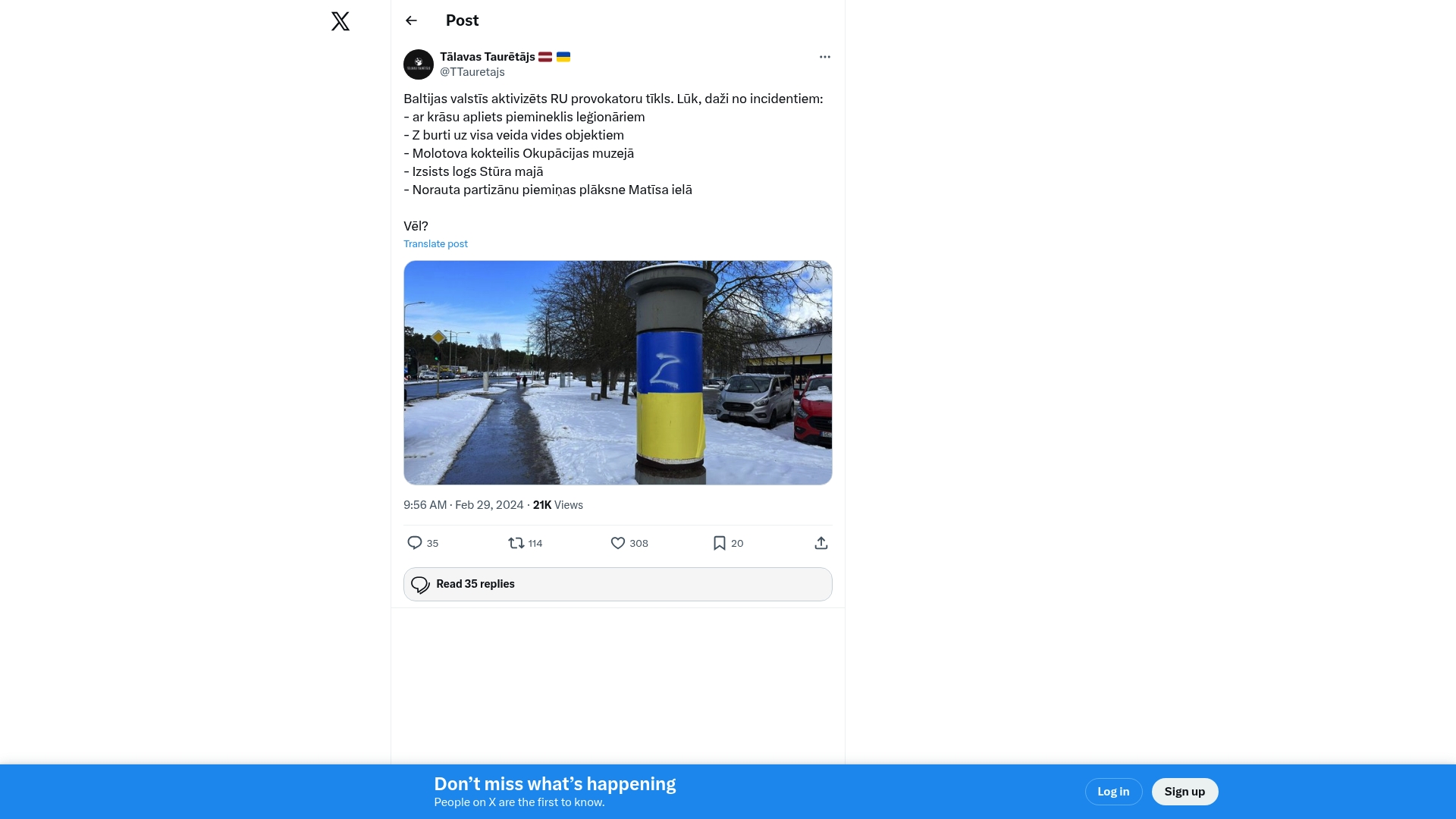 A post reports an uptick in provocations attributed to a Russian provocateur network in the Baltic states. Incidents include defacement of monuments, the letter Z painted on public property, a Molotov cocktail attack on the Occupation Museum, vandalism at Stūra House, and the removal of a partisan memorial plaque in Matīsa street.