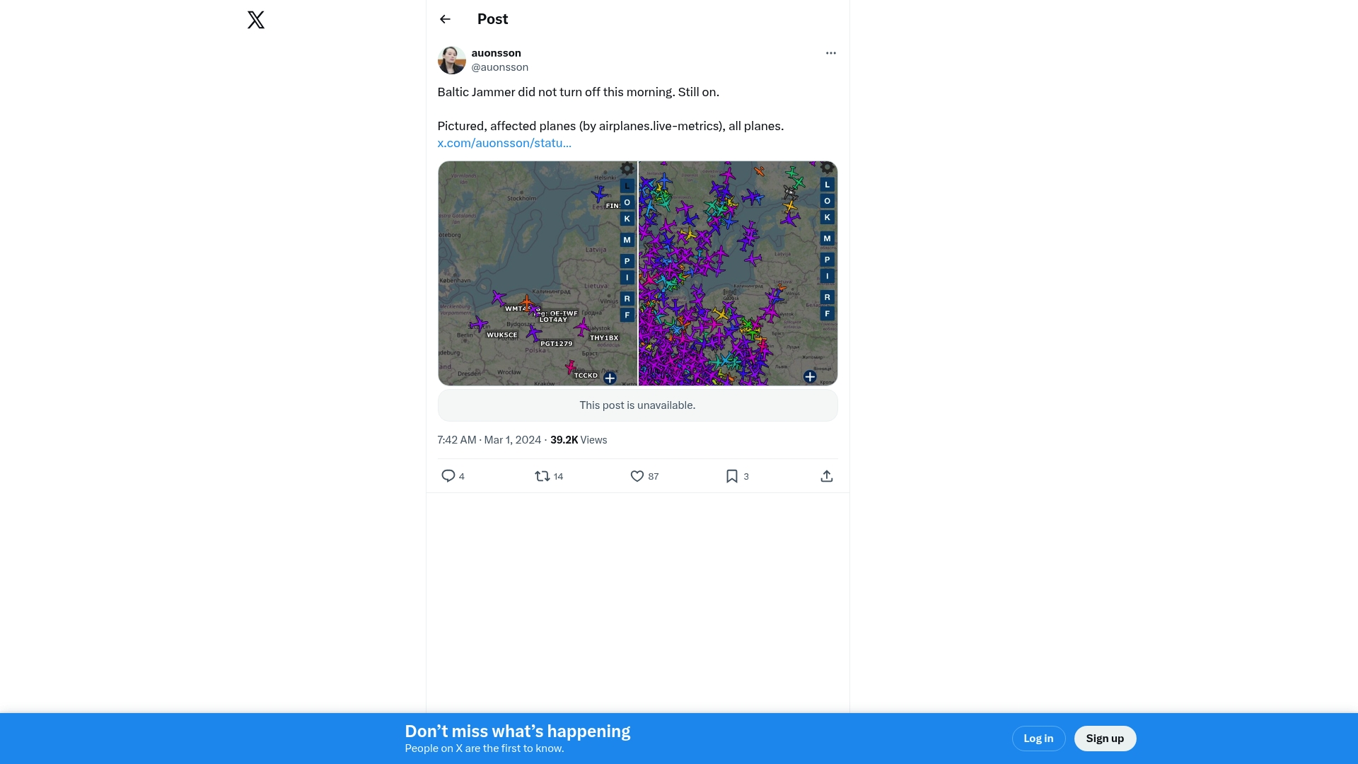 Short Summary: Ongoing electronic warfare jamming over the Baltic affects airplane activity as of March 1, 2024.