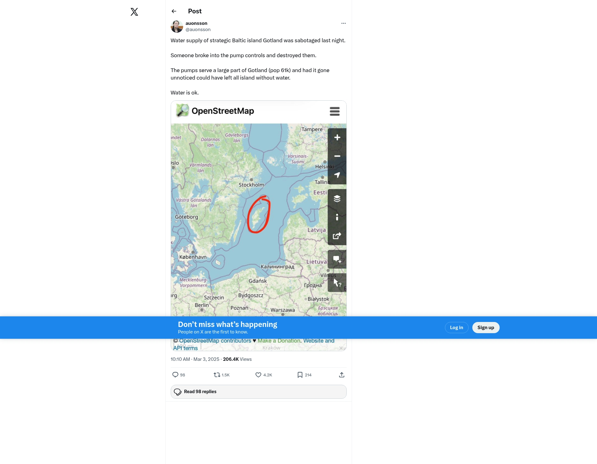 - "Water supply of strategic Baltic island Gotland was sabotaged last night."