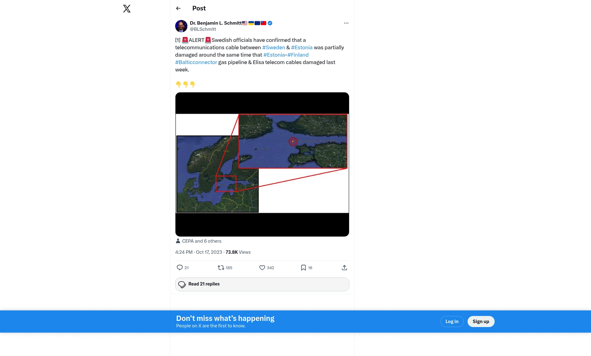 - "Swedish officials have confirmed that a telecommunications cable between #Sweden & #Estonia was partially damaged around the same time that #Estonia-#Finland #Balticconnector gas pipeline & Elisa tele..."