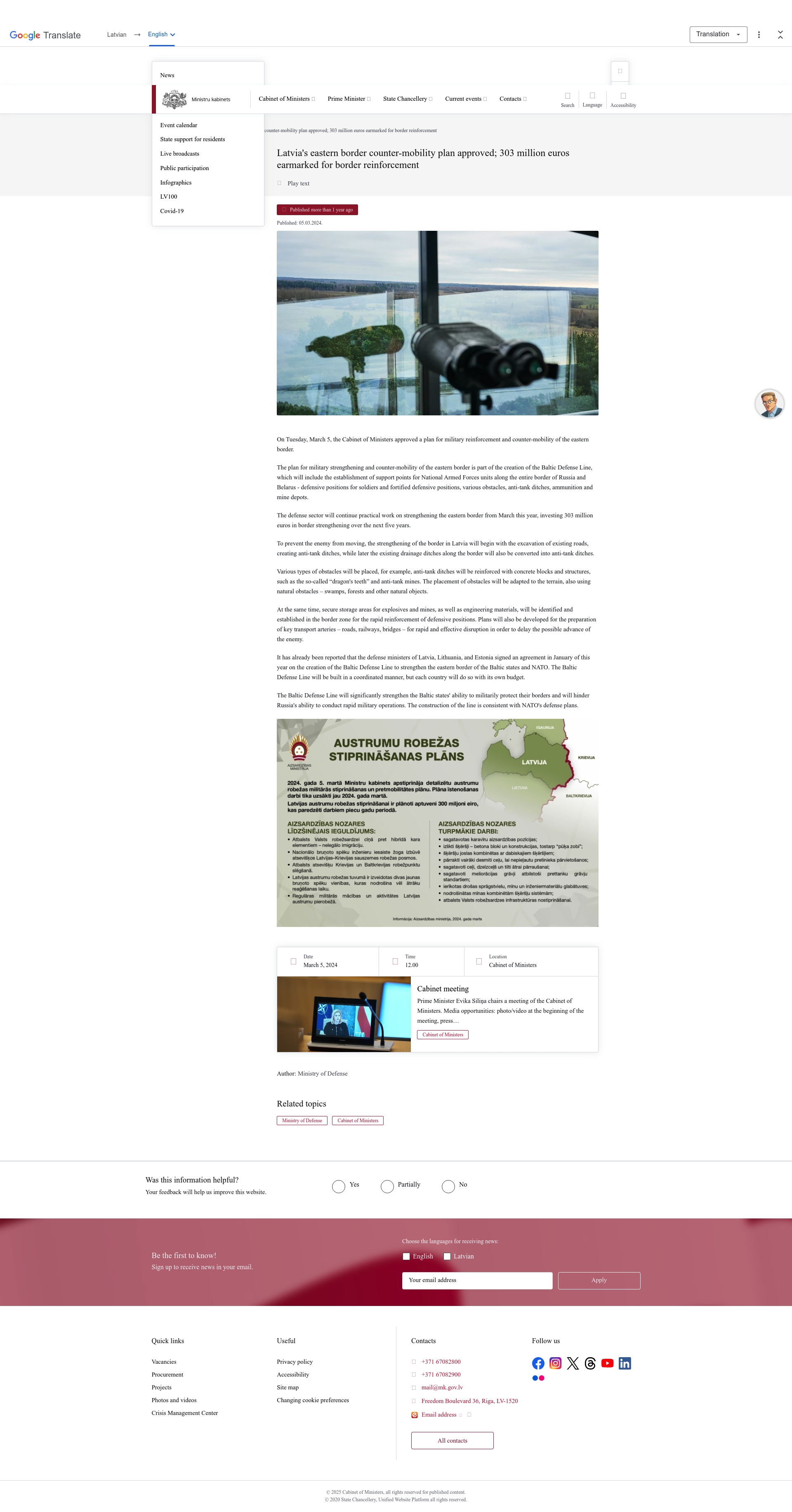 - "Latvia's eastern border counter-mobility plan approved; 303 million euros earmarked for border reinforcement"