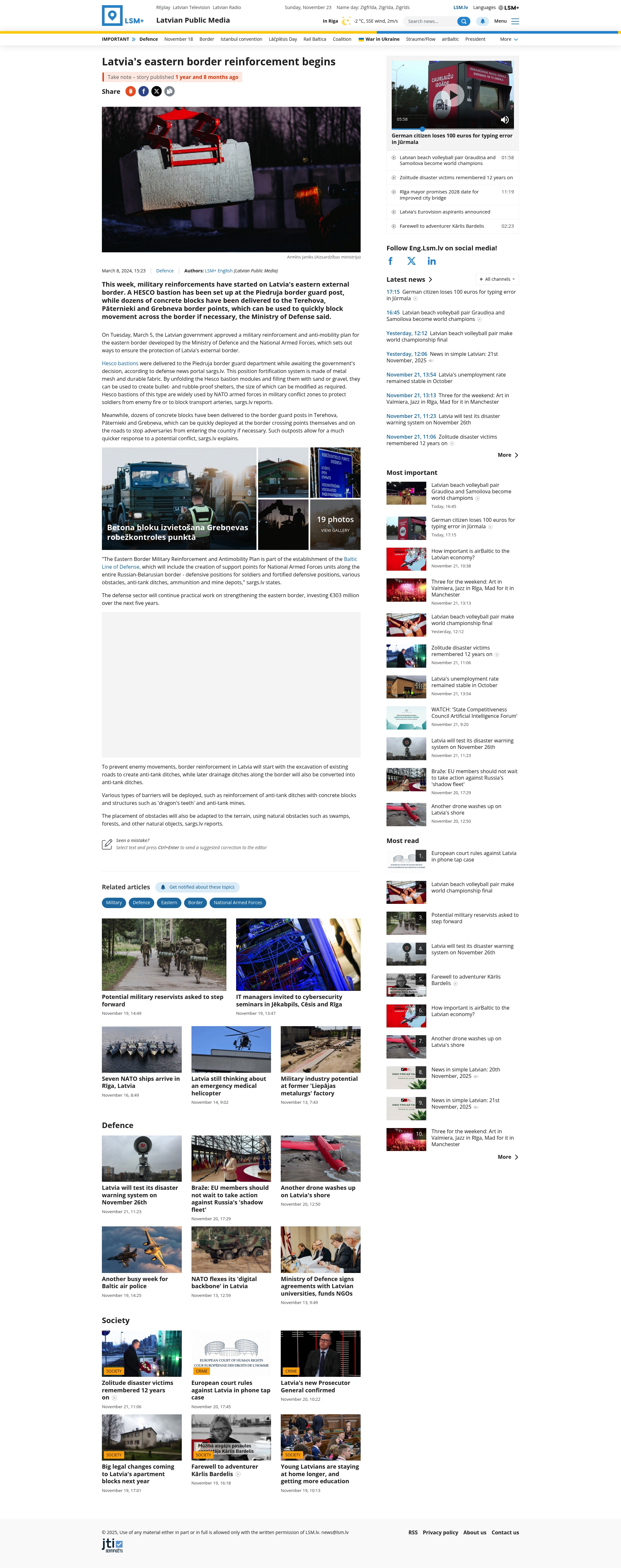 Latvia has commenced military reinforcements on its eastern external border, including the installation of a HESCO bastion at the Piedruja border guard post and delivery of concrete blocks to critical border points. These measures are part of a defense effort to protect against possible cross-border movements and threats.