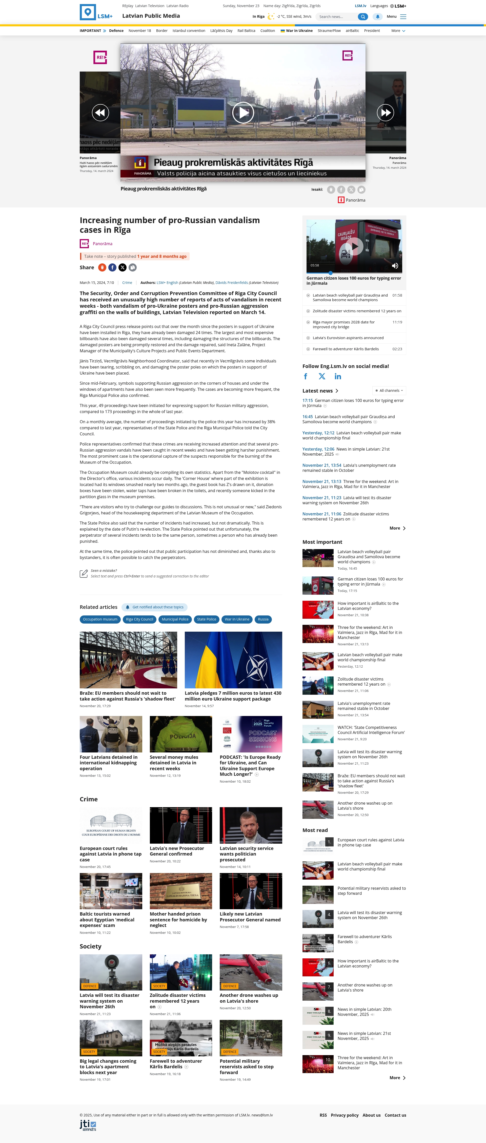 - "The Security, Order and Corruption Prevention Committee of Riga City Council has received an unusually high number of reports of acts of vandalism in recent weeks: both vandalism of pro-Ukraine poster..."
