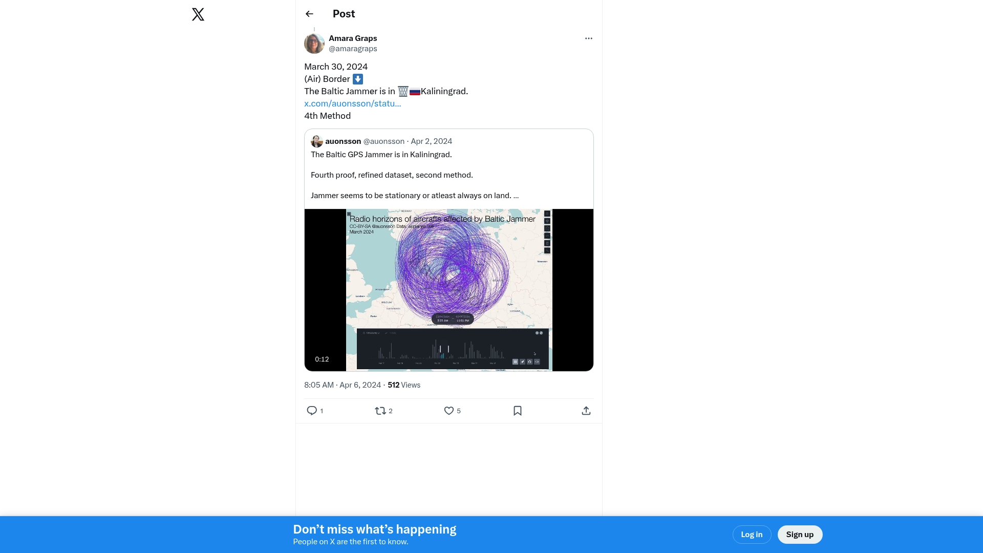 "description": "A social media post reporting the presence of a Baltic GPS jammer in Kaliningrad, Russia, with evidence indicating that the jammer is stationary or always on land, affecting airspace in the Baltic region. The report references a refined dataset and method for confirming the jammer's location.",